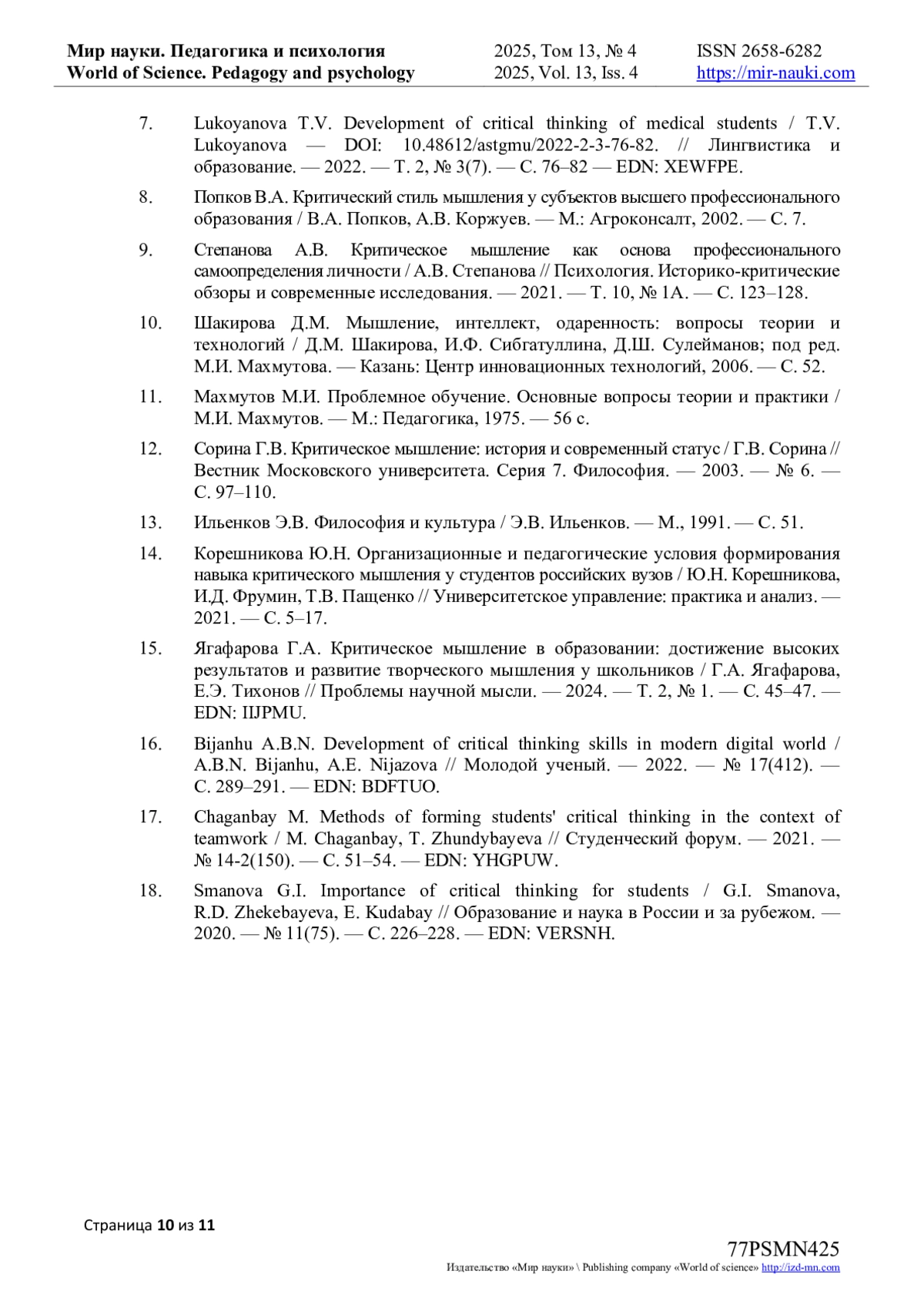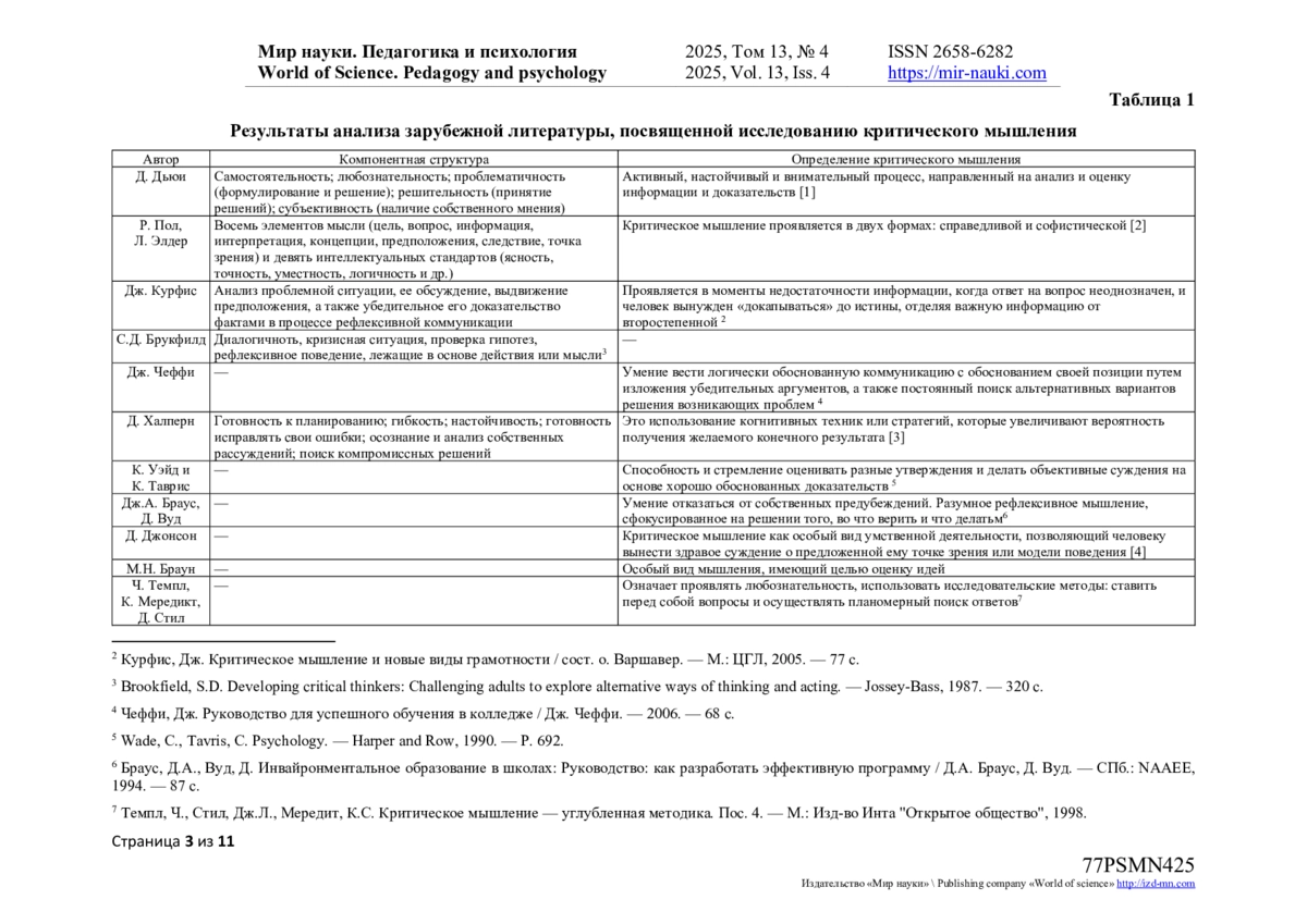 18. Smanova G.I. Importance of critical thinking for students / G.I. Smanova, R.D. Zhekebayeva, E. Kudabay // Образование и наука в России и за рубежом. - 2020. - № 11(75). - С. 226-228. -. EDN: VERSNH