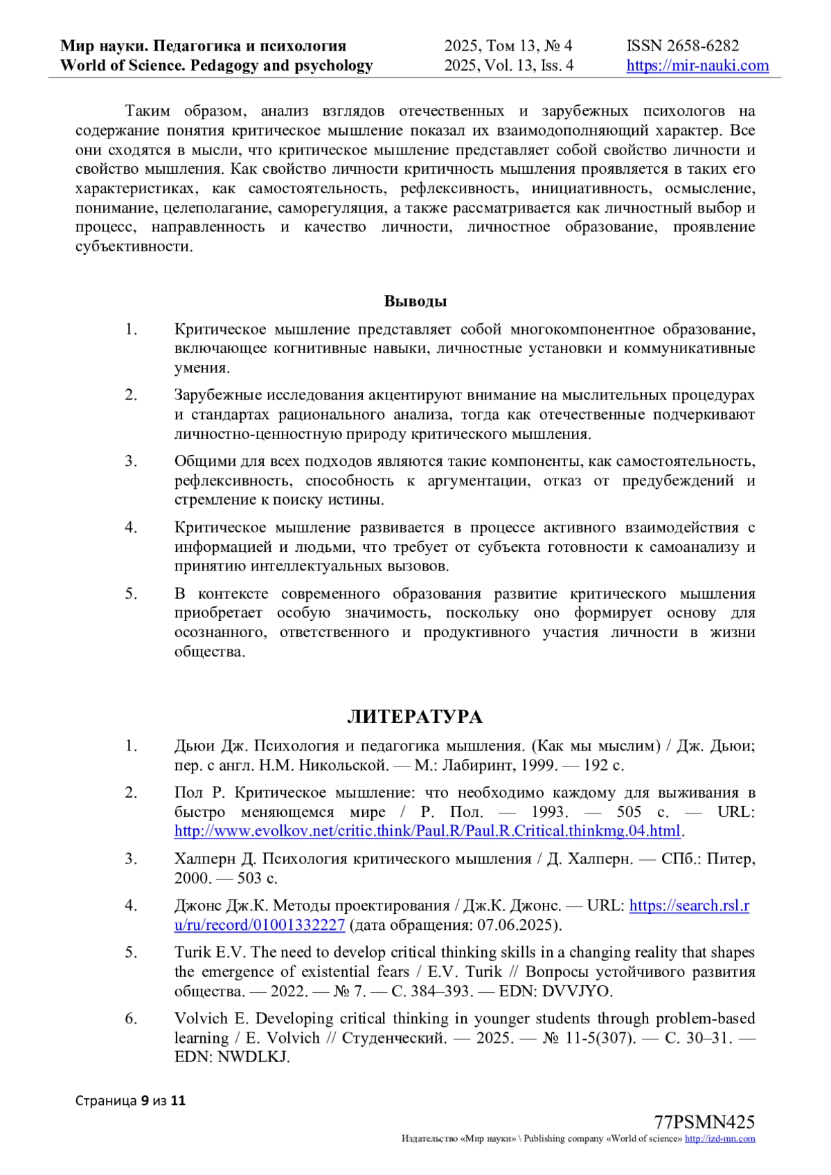 6. Volvich E. Developing critical thinking in younger students through problem-based learning / E. Volvich // Студенческий. - 2025. - № 11-5(307). - С. 30-31. -. EDN: NWDLKJ