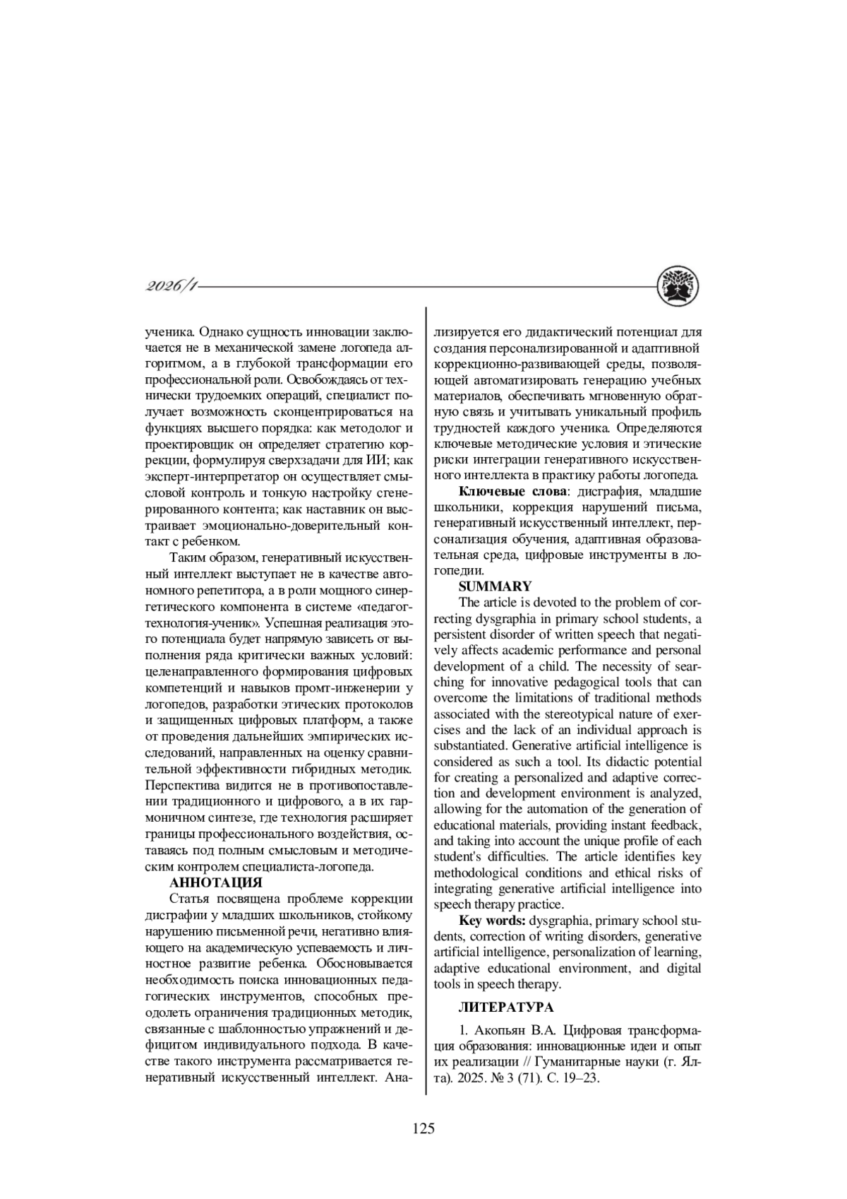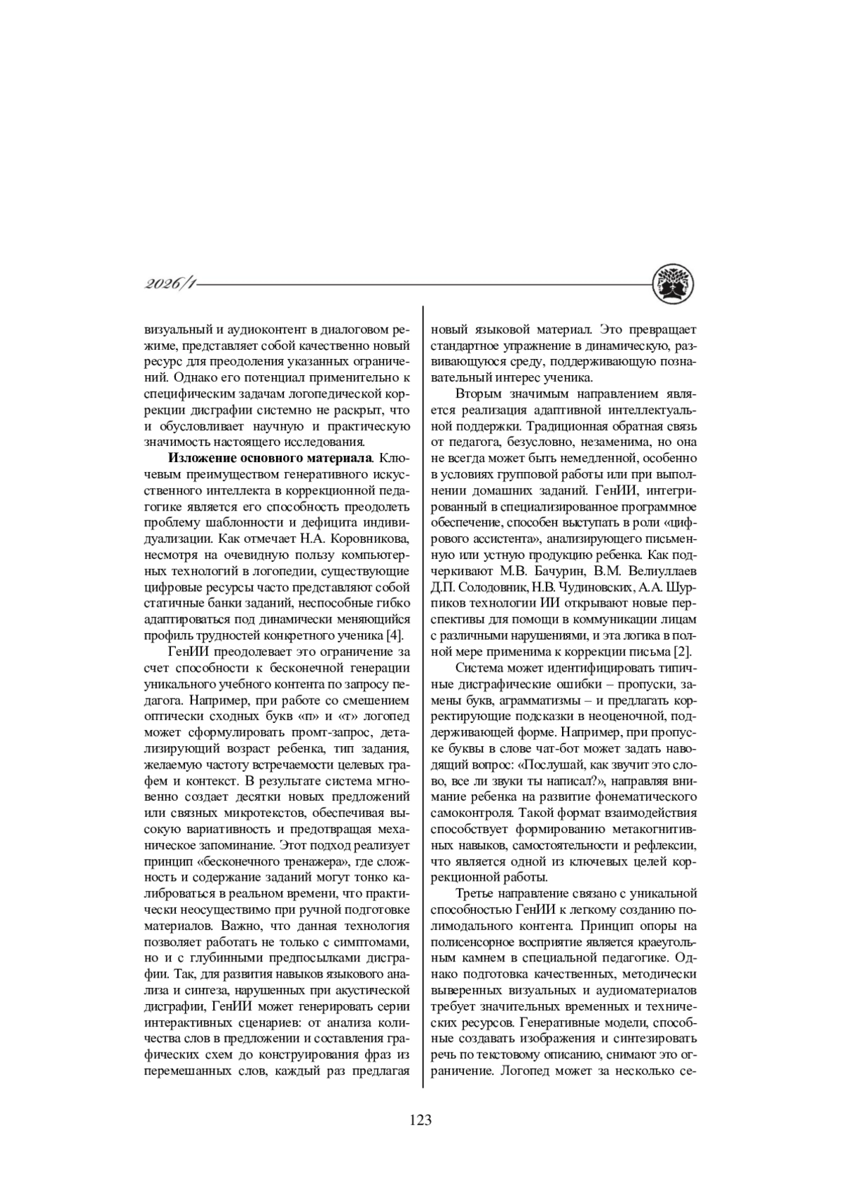 Статья посвящена проблеме коррекции дисграфии у младших школьников, стойкому нарушению письменной речи, негативно влияющего на академическую успеваемость и личностное развитие ребенка. Обосновывается необходимость поиска инновационных педагогических инструментов, способных преодолеть ограничения традиционных методик, связанные с шаблонностью упражнений и дефицитом индивидуального подхода. В качестве такого инструмента рассматривается генеративный искусственный интеллект. Анализируется его дидактический потенциал для создания персонализированной и адаптивной коррекционно-развивающей среды, позволяющей автоматизировать генерацию учебных материалов, обеспечивать мгновенную обратную связь и учитывать уникальный профиль трудностей каждого ученика. Определяются ключевые методические условия и этические риски интеграции генеративного искусственного интеллекта в практику работы логопеда.