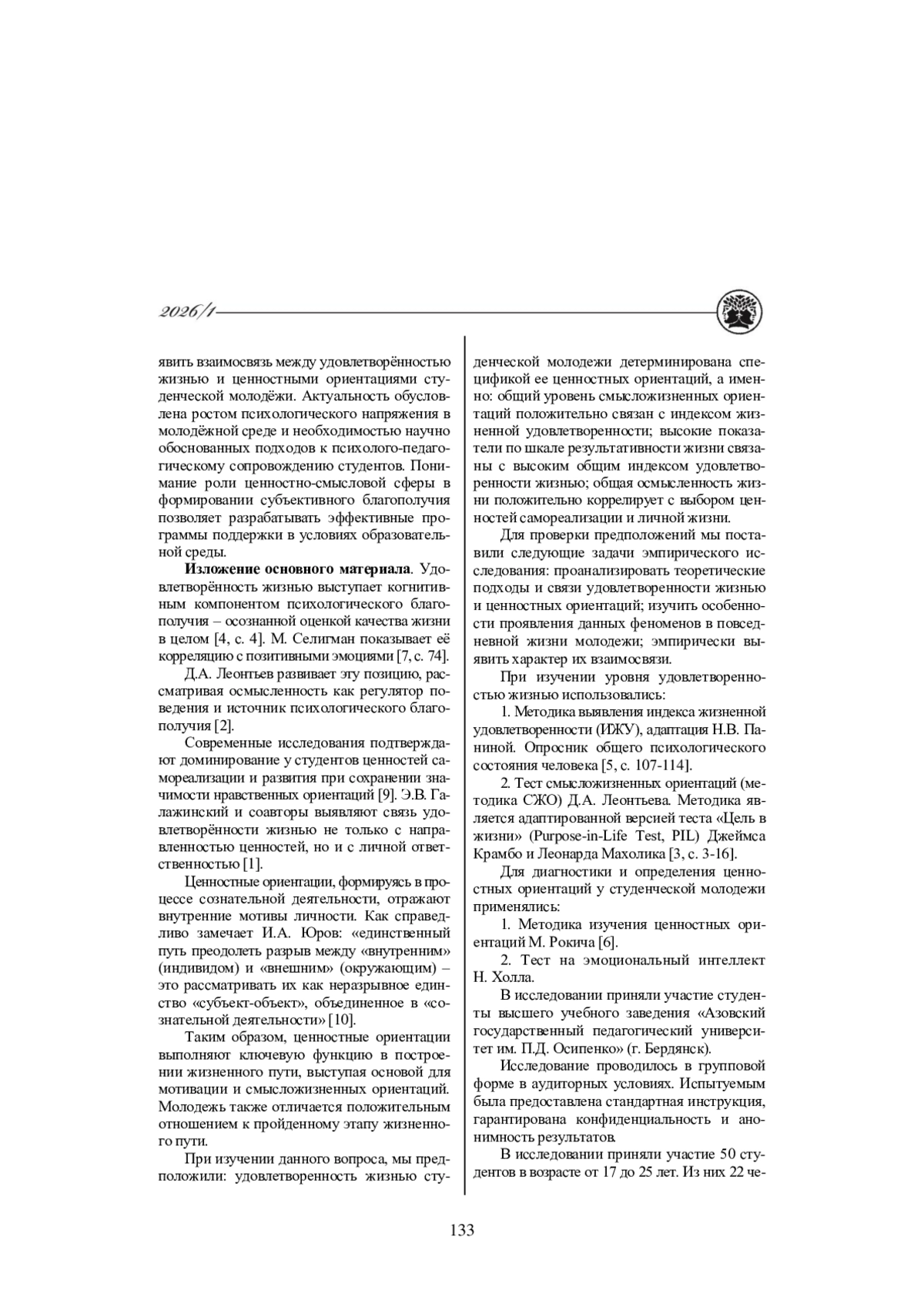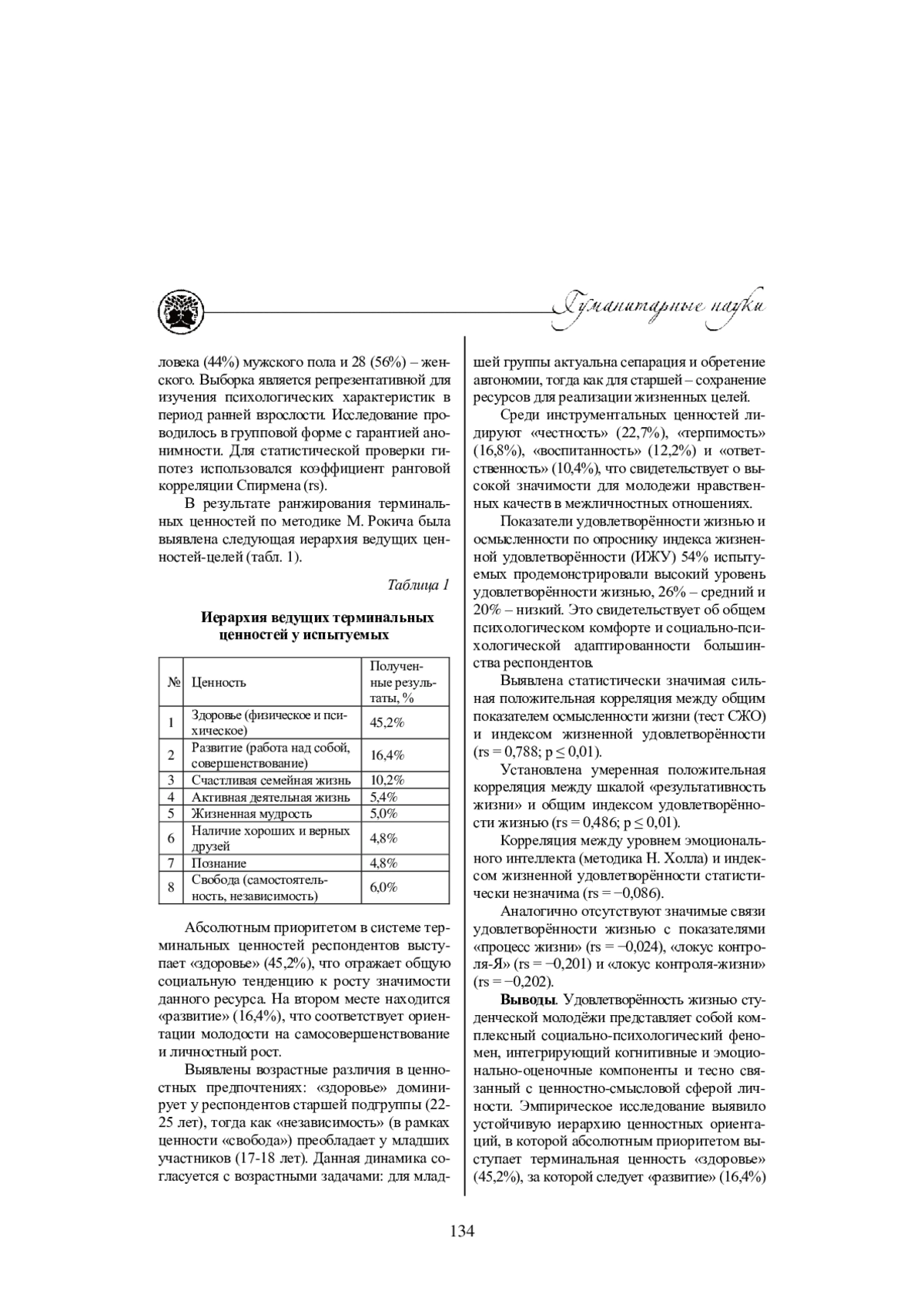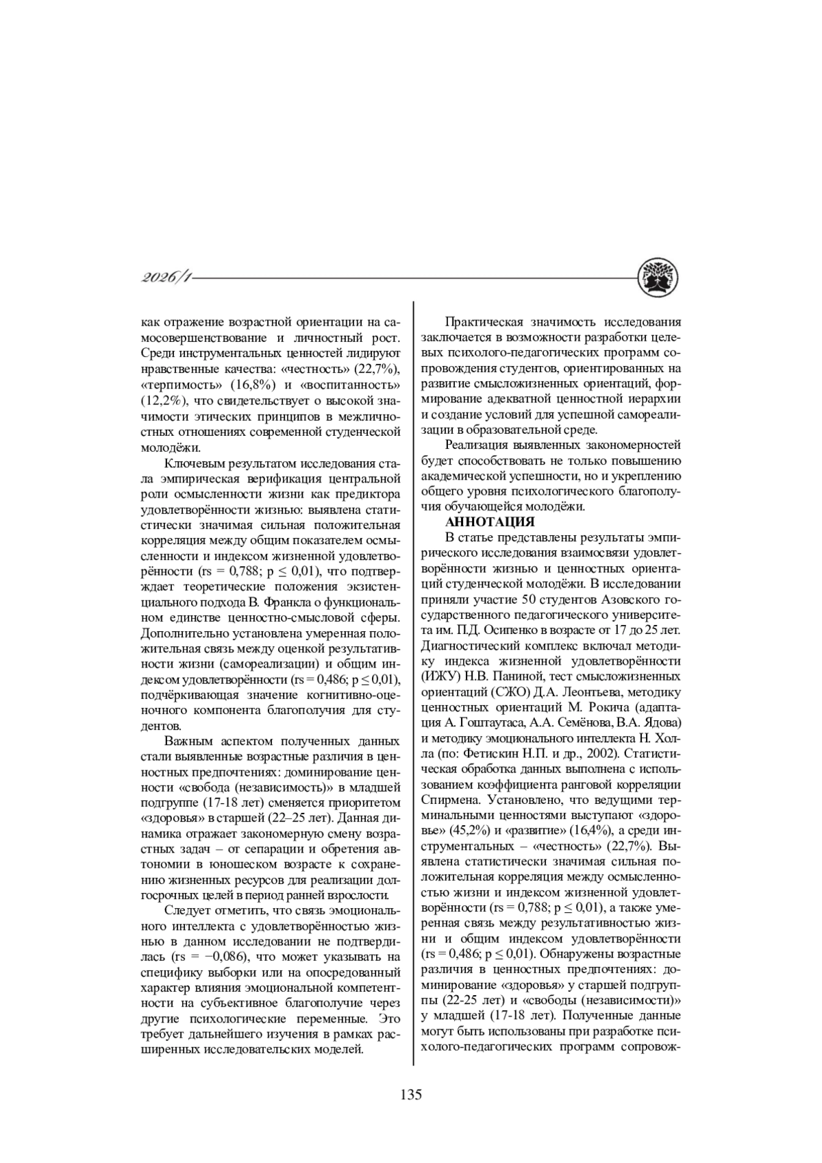 В статье представлены результаты эмпирического исследования взаимосвязи удовлетворённости жизнью и ценностных ориентаций студенческой молодёжи. В исследовании приняли участие 50 студентов Азовского государственного педагогического университета им. П. Д. Осипенко в возрасте от 17 до 25 лет. Диагностический комплекс включал методику индекса жизненной удовлетворённости (ИЖУ) Н. В. Паниной, тест смысложизненных ориентаций (СЖО) Д. А. Леонтьева, методику ценностных ориентаций М. Рокича (адаптация А. Гоштаутаса, А. А. Семёнова, В. А. Ядова) и методику эмоционального интеллекта Н. Холла (по: Фетискин Н. П. и др., 2002). Статистическая обработка данных выполнена с использованием коэффициента ранговой корреляции Спирмена. Установлено, что ведущими терминальными ценностями выступают «здоровье» (45,2%) и «развитие» (16,4%), а среди инструментальных - «честность» (22,7%). Выявлена статистически значимая сильная положительная корреляция между осмысленностью жизни и индексом жизненной удовлетворённости (rs = 0,788; p ≤ 0,01), а также умеренная связь между результативностью жизни и общим индексом удовлетворённости (rs = 0,486; p ≤ 0,01). Обнаружены возрастные различия в ценностных предпочтениях: доминирование «здоровья» у старшей подгруппы (22-25 лет) и «свободы (независимости)» у младшей (17-18 лет). Полученные данные могут быть использованы при разработке психолого-педагогических программ сопровождения студентов, направленных на развитие смысложизненных ориентаций и гармонизацию ценностной сферы.