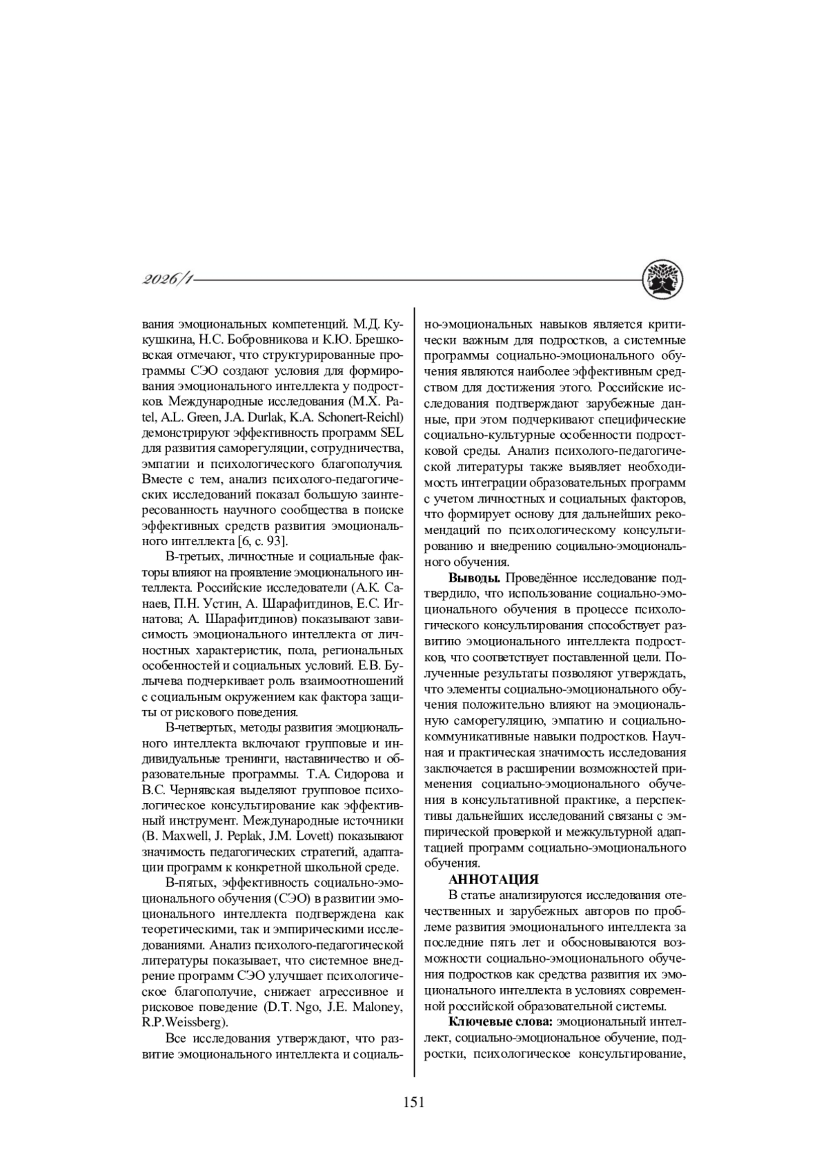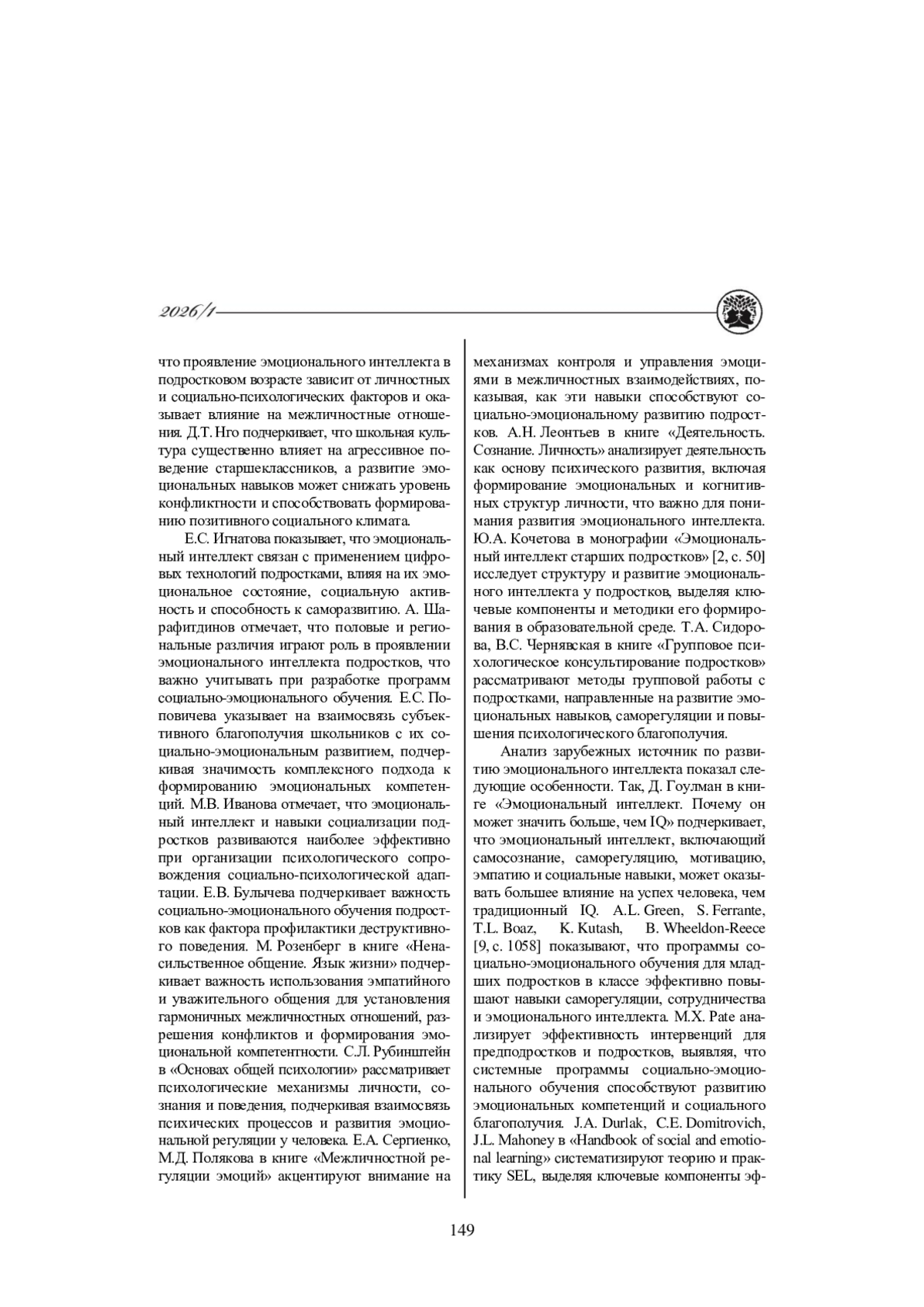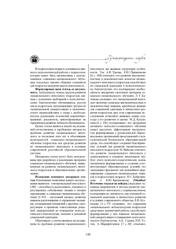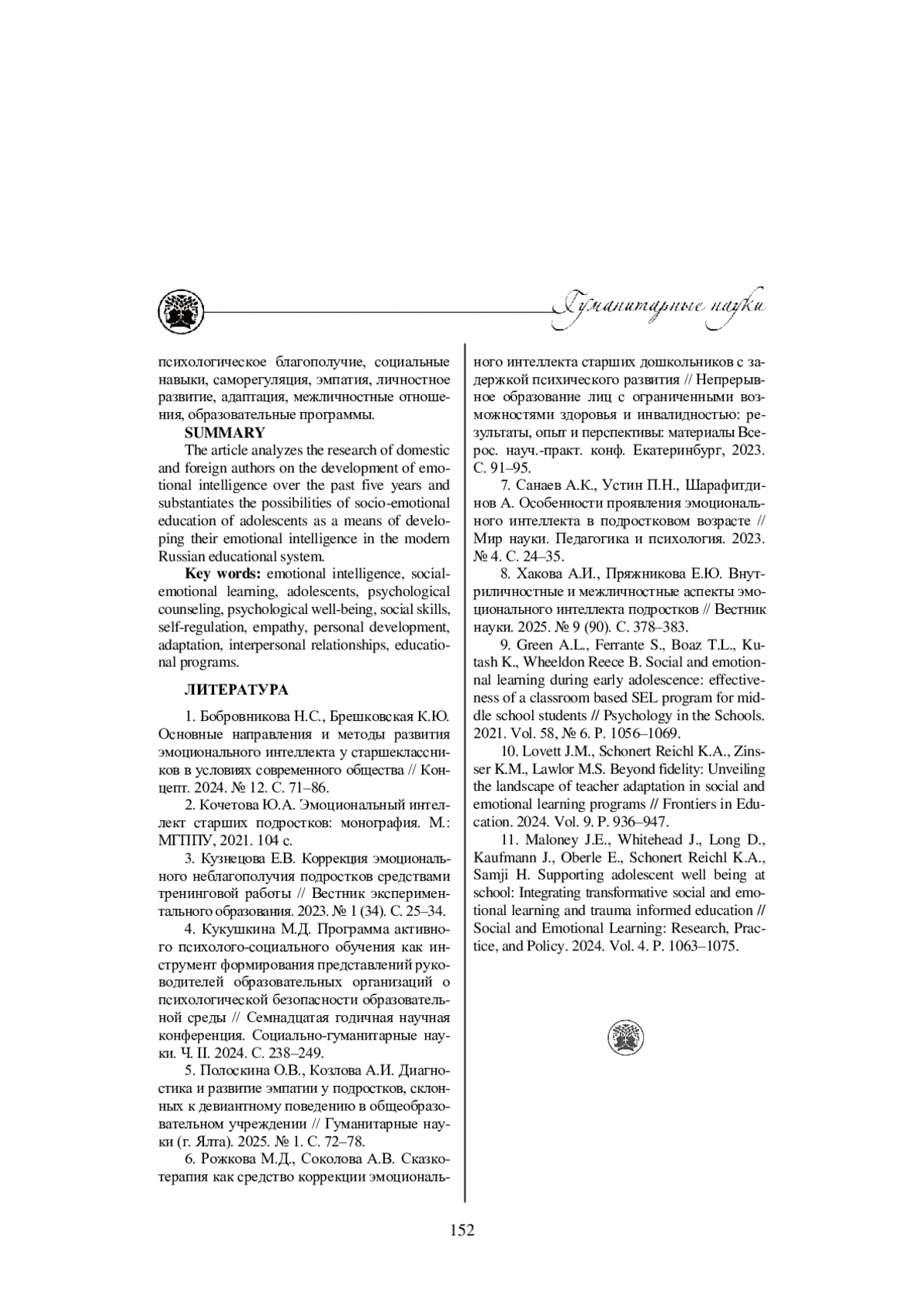 8. Хакова А.И., Пряжникова Е.Ю. Внутриличностные и межличностные аспекты эмоционального интеллекта подростков // Вестник науки. 2025. № 9 (90). С. 378-383.