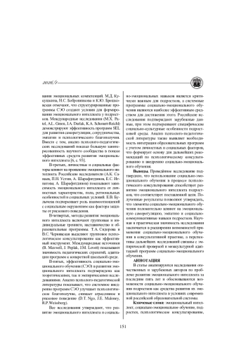 1. Бобровникова Н.С., Брешковская К.Ю. Основные направления и методы развития эмоционального интеллекта у старшеклассников в условиях современного общества // Концепт. 2024. № 12. С. 71-86.