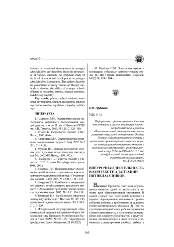 4. Зейнелова К.Г, Галиева С.Ю. Адаптация пятиклассноков к условиям обучения в среднем звене общеобразовательной школы // Гуманитарные исследования. Педагогика и психология.2023. №14. С. 39-52.