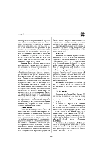Статья посвящена анализу особенностей организации внеурочной деятельности в условиях адаптации пятиклассников. На основе изучения теоретических исследований выявлена разрозненность представлений о внеурочной деятельности как об условии интеграции обучающихся. Описаны ее характерные черты. К механизмам интеграции, способствующим плавной адаптации, отнесены деятельность детских общественных движений, наставничество, коллективно-творческие дела, самоуправление и развитие рефлексии. Сделан вывод о широком интегративном потенциале внеурочной деятельности в условиях адаптации при переходе в среднюю школу.