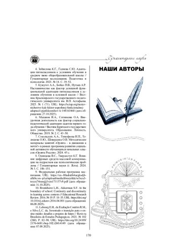 11. Lebourg E. H., da Exaltação Coutrim R. M. e Silva L. C. da. Juventude e transição para o ensino médio: desafios e projetos de futuro. Revista Brasileira de Estudos Pedagogicos. 2021. №102(260). С. 82-98. 10.24109 /2176-6681.rbep.102.i260.4149 (дата обращения: 07.09.2025).
