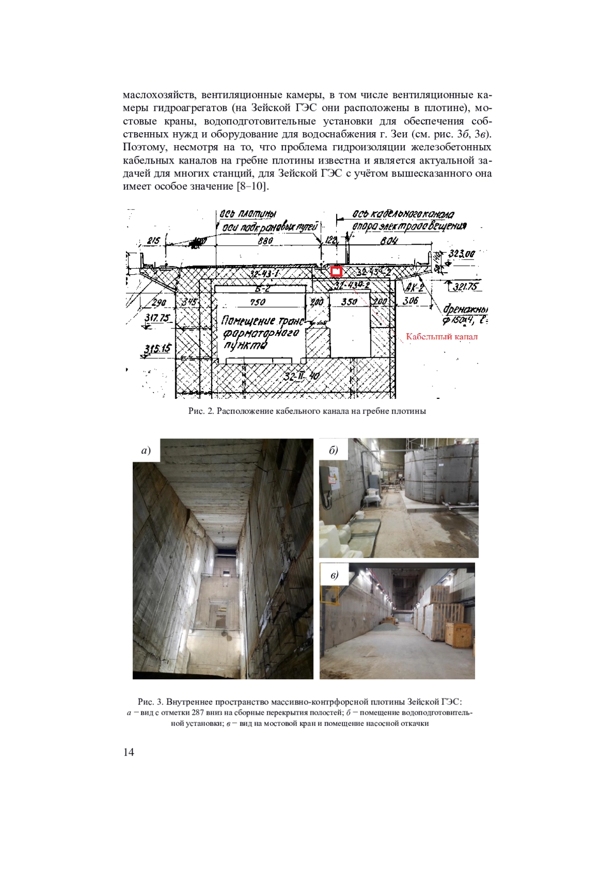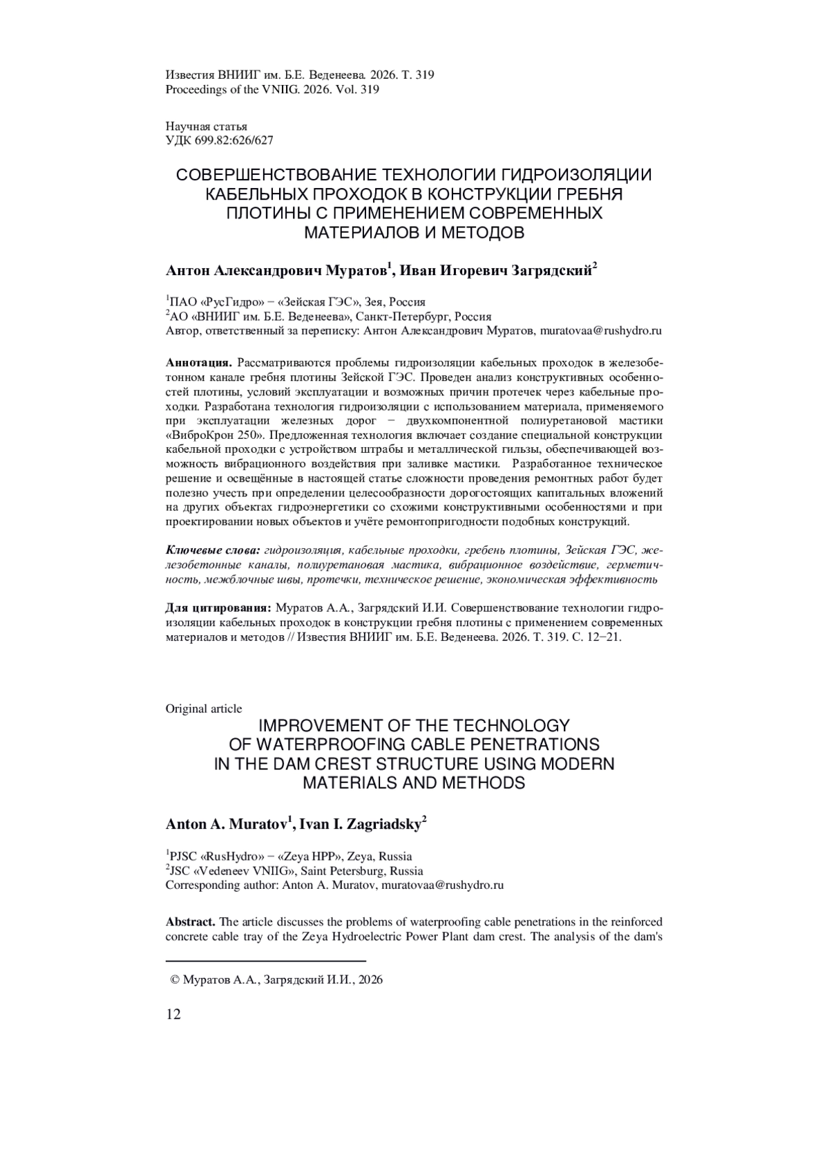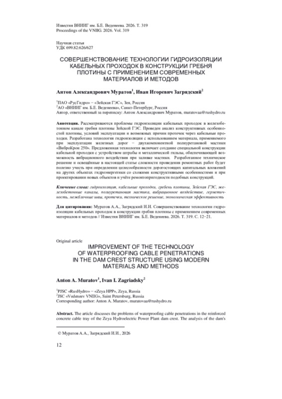 Рассматриваются проблемы гидроизоляции кабельных проходок в железобетонном канале гребня плотины Зейской ГЭС. Проведен анализ конструктивных особенностей плотины, условий эксплуатации и возможных причин протечек через кабельные проходки. Разработана технология гидроизоляции с использованием материала, применяемого при эксплуатации железных дорог − двухкомпонентной полиуретановой мастики «ВиброКрон 250». Предложенная технология включает создание специальной конструкции кабельной проходки с устройством штрабы и металлической гильзы, обеспечивающей возможность вибрационного воздействия при заливке мастики. Разработанное техническое решение и освещѐнные в настоящей статье сложности проведения ремонтных работ будет полезно учесть при определении целесообразности дорогостоящих капитальных вложений на других объектах гидроэнергетики со схожими конструктивными особенностями и при проектировании новых объектов и учѐте ремонтопригодности подобных конструкций.