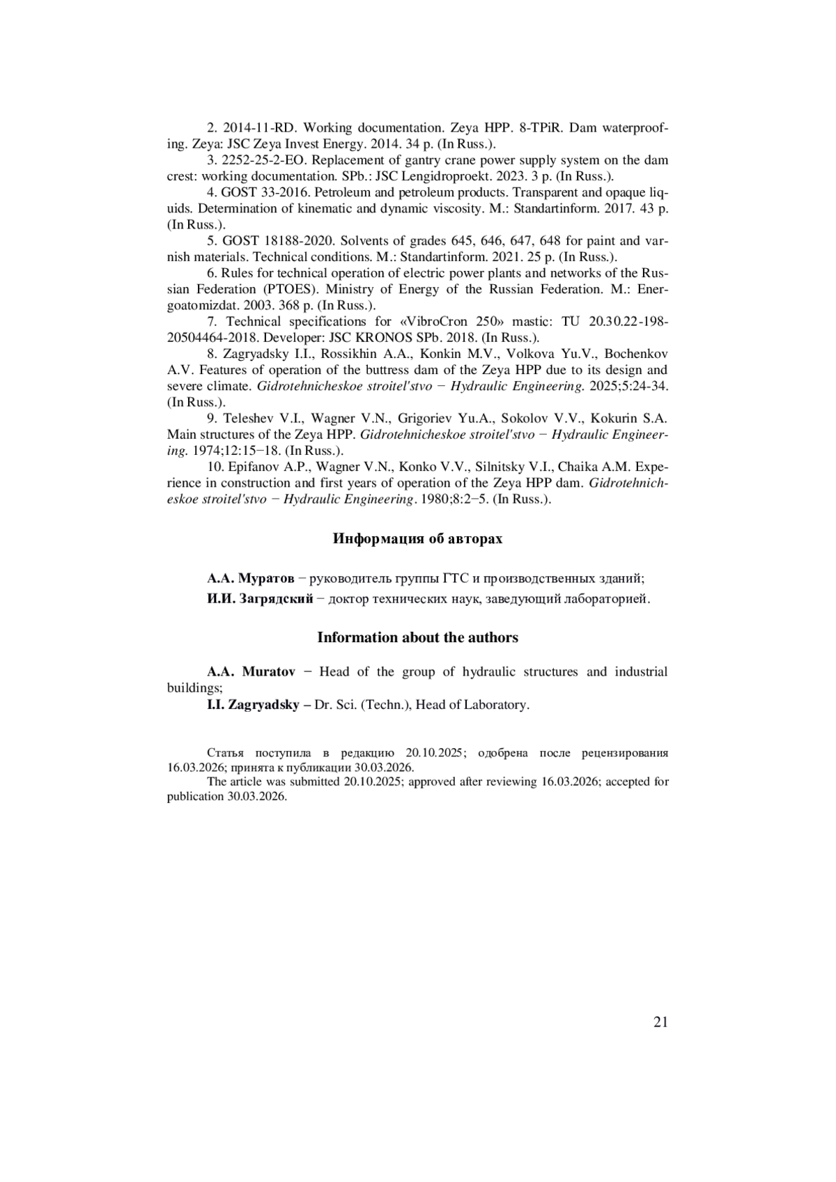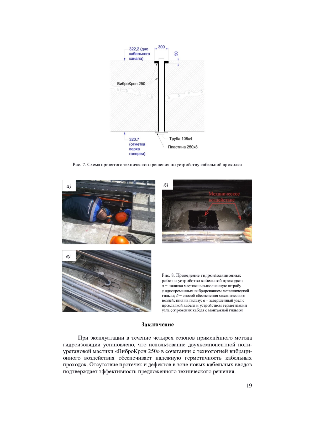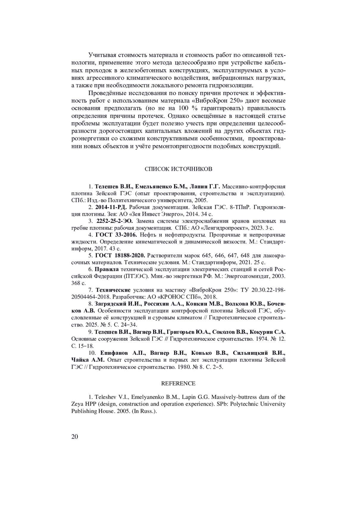Рассматриваются проблемы гидроизоляции кабельных проходок в железобетонном канале гребня плотины Зейской ГЭС. Проведен анализ конструктивных особенностей плотины, условий эксплуатации и возможных причин протечек через кабельные проходки. Разработана технология гидроизоляции с использованием материала, применяемого при эксплуатации железных дорог − двухкомпонентной полиуретановой мастики «ВиброКрон 250». Предложенная технология включает создание специальной конструкции кабельной проходки с устройством штрабы и металлической гильзы, обеспечивающей возможность вибрационного воздействия при заливке мастики. Разработанное техническое решение и освещѐнные в настоящей статье сложности проведения ремонтных работ будет полезно учесть при определении целесообразности дорогостоящих капитальных вложений на других объектах гидроэнергетики со схожими конструктивными особенностями и при проектировании новых объектов и учѐте ремонтопригодности подобных конструкций.