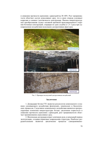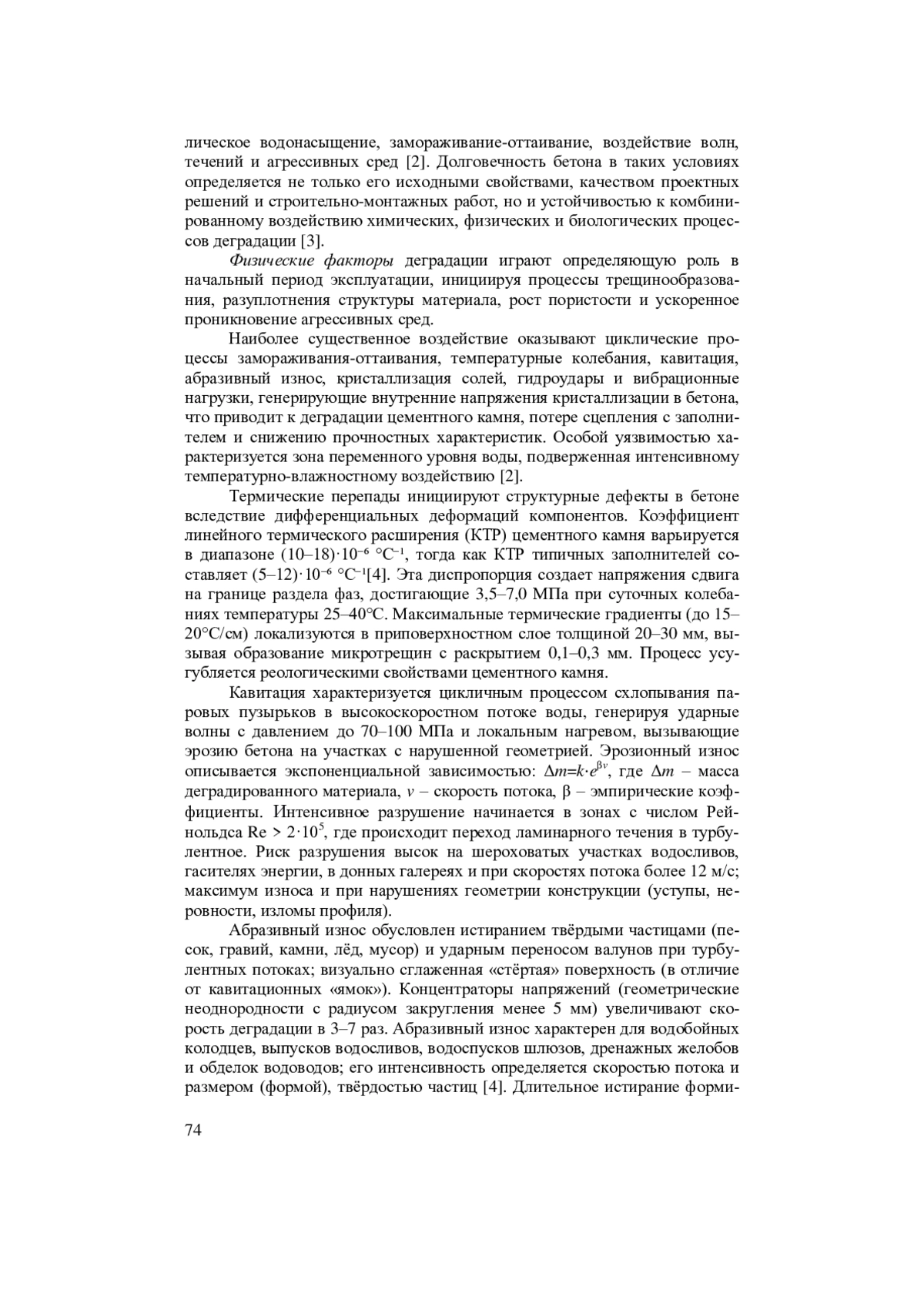 Проведен комплексный анализ факторов деградации бетона гидротехнических сооружений. На основе систематизации литературных данных деструктивные процессы классифицированы на физические, химические и биологические. Детально рассмотрены их механизмы, включая циклы замораживания-оттаивания, кавитацию, сульфатную коррозию и биоповреждения. Особое внимание уделено синергетическому эффекту от совместного воздействия разнородных факторов, который значительно ускоряет снижение прочности и долговечности бетона. Установлено, что ключевым звеном разрушения является прогрессирующее микроструктурное повреждение цементного камня.