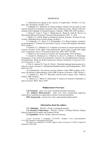 2. Охапкин Г.В. Обоснование рациональных технических решений по ремонту площадных разрушений бетона гидротехнических сооружений в зоне переменного уровня: автореферат дис. … канд. техн. наук. АО “ВНИИГ им. Б.Е. Веденеева”. СПб., 2019.