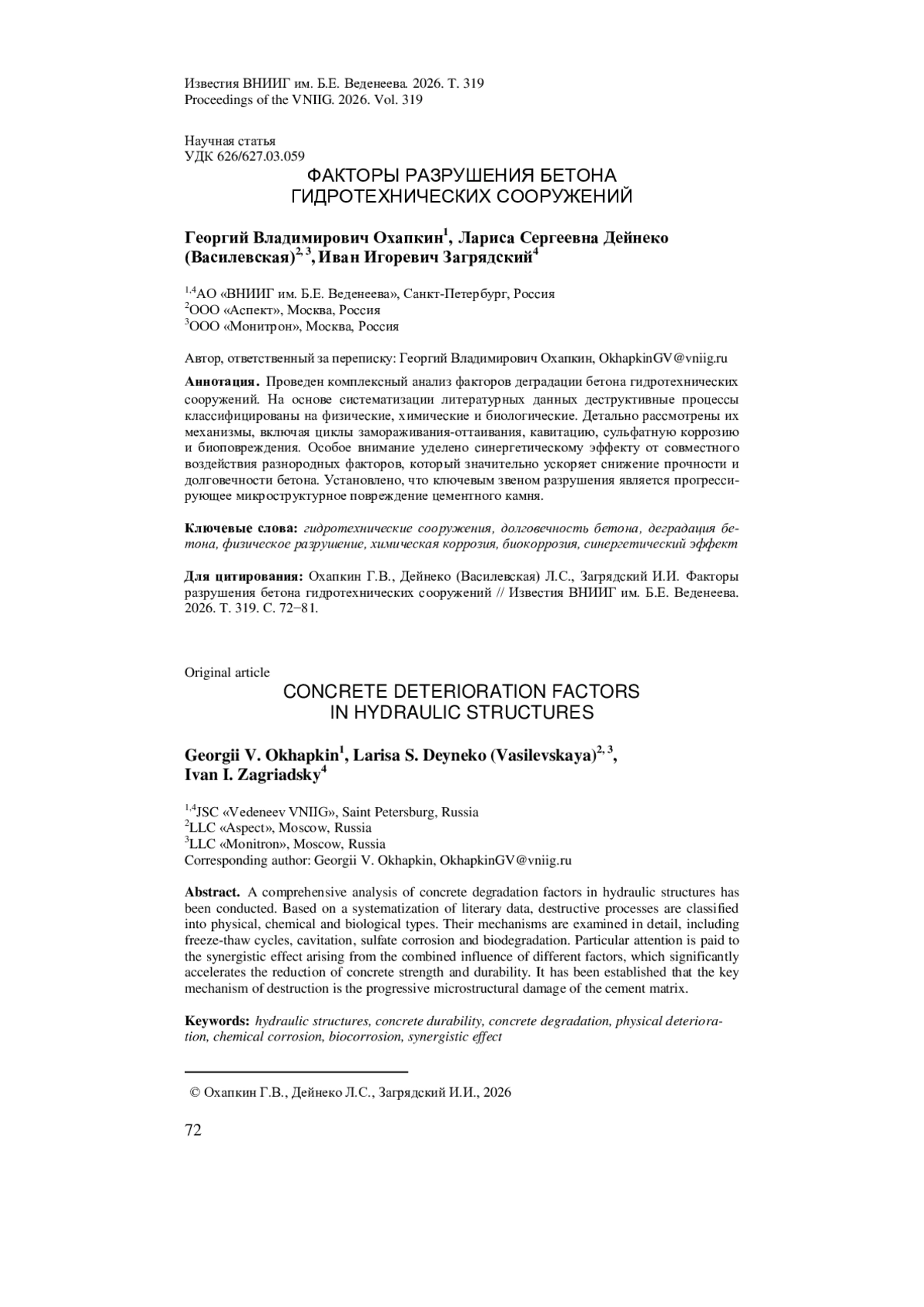 6. Deineko L.S., Okhapkin G.V. Condition assessment of concrete and reinforced concrete structures of the upper Volga hydroelectric power plant cascade after eighty years of operation // Power Technology Engineering, 2025, V. 58. № 5. P. 793-800.