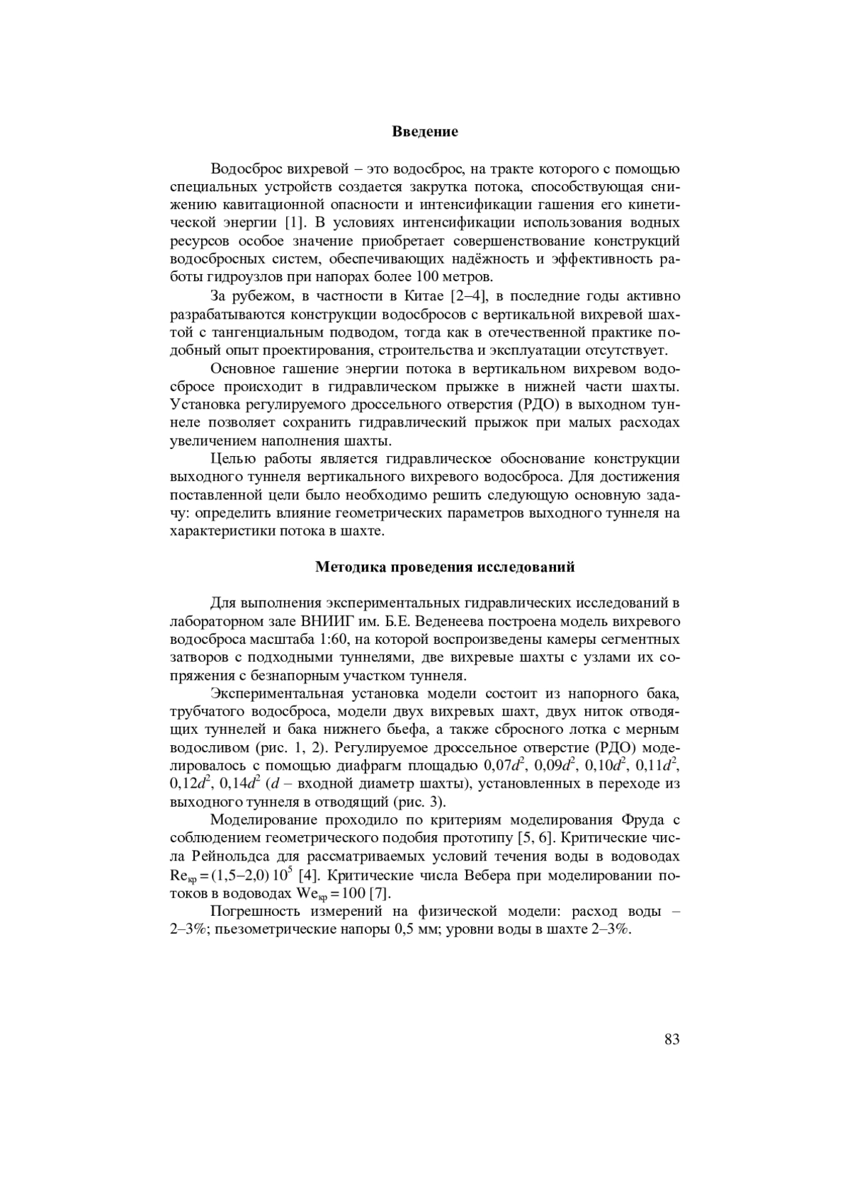 Водосброс вихревой это водосброс, на тракте которого с помощью специальных устройств создается закрутка потока, способствующая снижению кавитационной опасности и интенсификации гашения его кинетической энергии [1]. В условиях интенсификации использования водных ресурсов особое значение приобретает совершенствование конструкций водосбросных систем, обеспечивающих надѐжность и эффективность ра-боты гидроузлов при напорах более 100 метров.