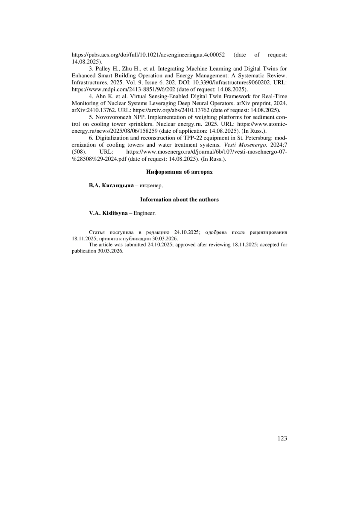 2. Pandey A. et al. Digital Twin of an Open Cooling Tower: Experimental Studies. ACS Engineering Au. 2024. URL: https://pubs.acs.org/doi/full/ (дата обращения: 14.08.2025). DOI: 10.1021/acsengineeringau.4c00052