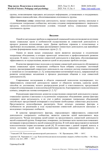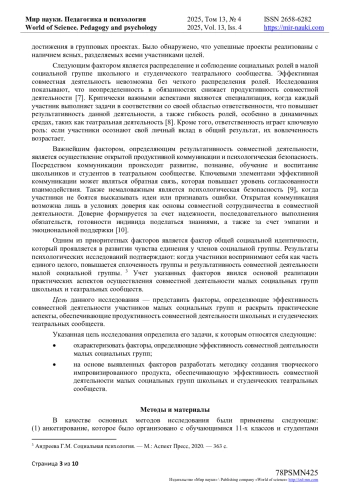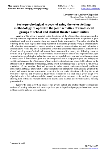 Статья посвящена описанию методики «Storytelling», направленной на создание творческого импровизированного продукта и этапов ее реализации в процессе осуществления совместной деятельности малых социальных групп в школьных и студенческих театральных сообществах. В качестве основных этапов автор выделяет следующие: погружение обучающихся в ситуативную позицию; постановка коммуникативной задачи; выбор коммуникативных средств; создание творческого коммуникативного продукта; достижение коммуникативного результата. В статье рассматриваются факторы, обеспечивающие эффективность совместной деятельности малых социальных групп школьных и студенческих театральных сообществ, а именно следующие: общность мотивов; единство целей и способов их достижения; четкое распределение ролей и ответственности; открытая коммуникация; психологическая безопасность; благоприятный психологический климат, доверие как основа сотрудничества. Особое место в статье отводится детальному представлению психолого-педагогический условий, обеспечивающих эффективность совместной деятельности студентов и школьников на основе применения предлагаемой методики, среди которых ведущее место отводится следующим: ориентация творческого театрального процесса на решение актуальных социально-психологических задач; учет возрастных особенностей и личностных интересов членов малых социальных групп школьного и студенческого театрального сообщества; погружение в реальные социальные ситуации, отражающие актуальные проблемы личностного и профессионального развития участников малой социальной группы; высокий уровень владения вербальными и невербальными средствами общения участниками малой социальной группы, позволяющими передавать актуальную информацию, устанавливать и поддерживать эффективное взаимодействие, обеспечивающими сплоченность группы.