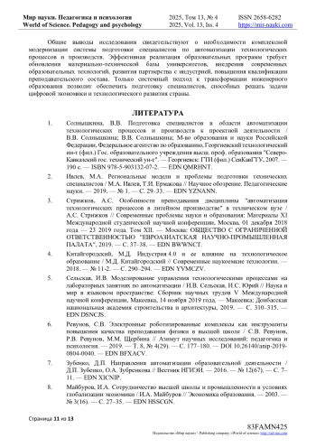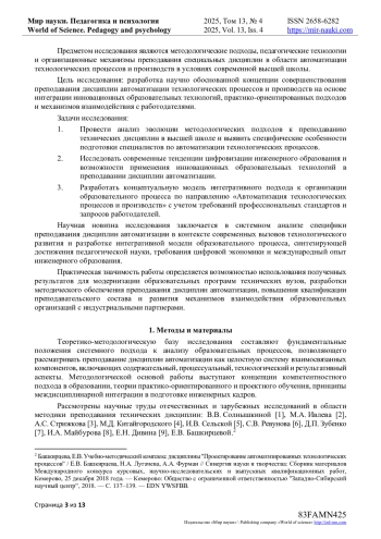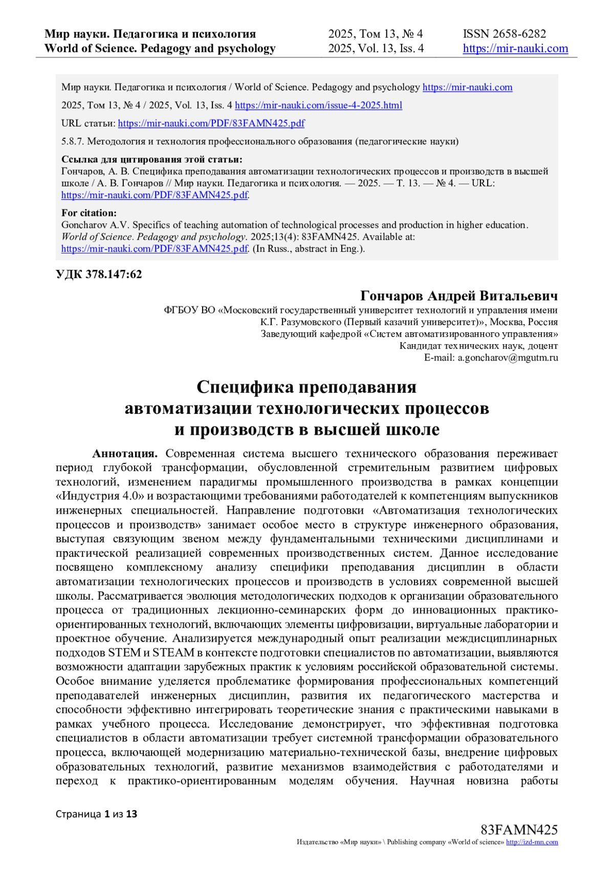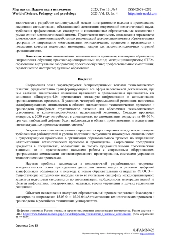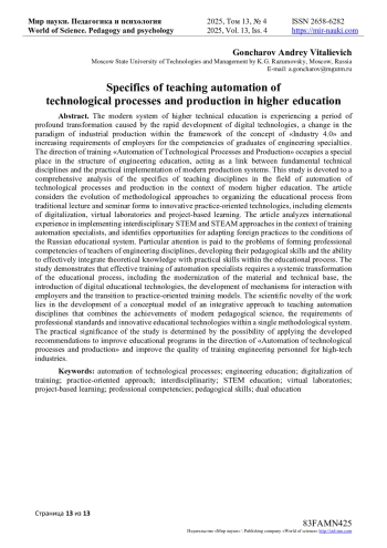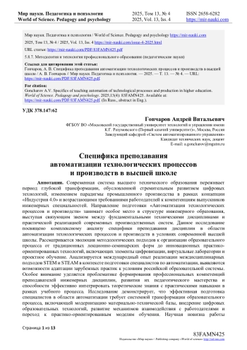 Современная система высшего технического образования переживает период глубокой трансформации, обусловленной стремительным развитием цифровых технологий, изменением парадигмы промышленного производства в рамках концепции «Индустрия 4.0» и возрастающими требованиями работодателей к компетенциям выпускников инженерных специальностей. Направление подготовки «Автоматизация технологических процессов и производств» занимает особое место в структуре инженерного образования, выступая связующим звеном между фундаментальными техническими дисциплинами и практической реализацией современных производственных систем. Данное исследование посвящено комплексному анализу специфики преподавания дисциплин в области автоматизации технологических процессов и производств в условиях современной высшей школы. Рассматривается эволюция методологических подходов к организации образовательного процесса от традиционных лекционно-семинарских форм до инновационных практико-ориентированных технологий, включающих элементы цифровизации, виртуальные лаборатории и проектное обучение. Анализируется международный опыт реализации междисциплинарных подходов STEM и STEAM в контексте подготовки специалистов по автоматизации, выявляются возможности адаптации зарубежных практик к условиям российской образовательной системы. Особое внимание уделяется проблематике формирования профессиональных компетенций преподавателей инженерных дисциплин, развития их педагогического мастерства и способности эффективно интегрировать теоретические знания с практическими навыками в рамках учебного процесса. Исследование демонстрирует, что эффективная подготовка специалистов в области автоматизации требует системной трансформации образовательного процесса, включающей модернизацию материально-технической базы, внедрение цифровых образовательных технологий, развитие механизмов взаимодействия с работодателями и переход к практико-ориентированным моделям обучения. Научная новизна работы заключается в разработке концептуальной модели интегративного подхода к преподаванию дисциплин автоматизации, объединяющей достижения современной педагогической науки, требования профессиональных стандартов и инновационные образовательные технологии в рамках единой методологической системы.