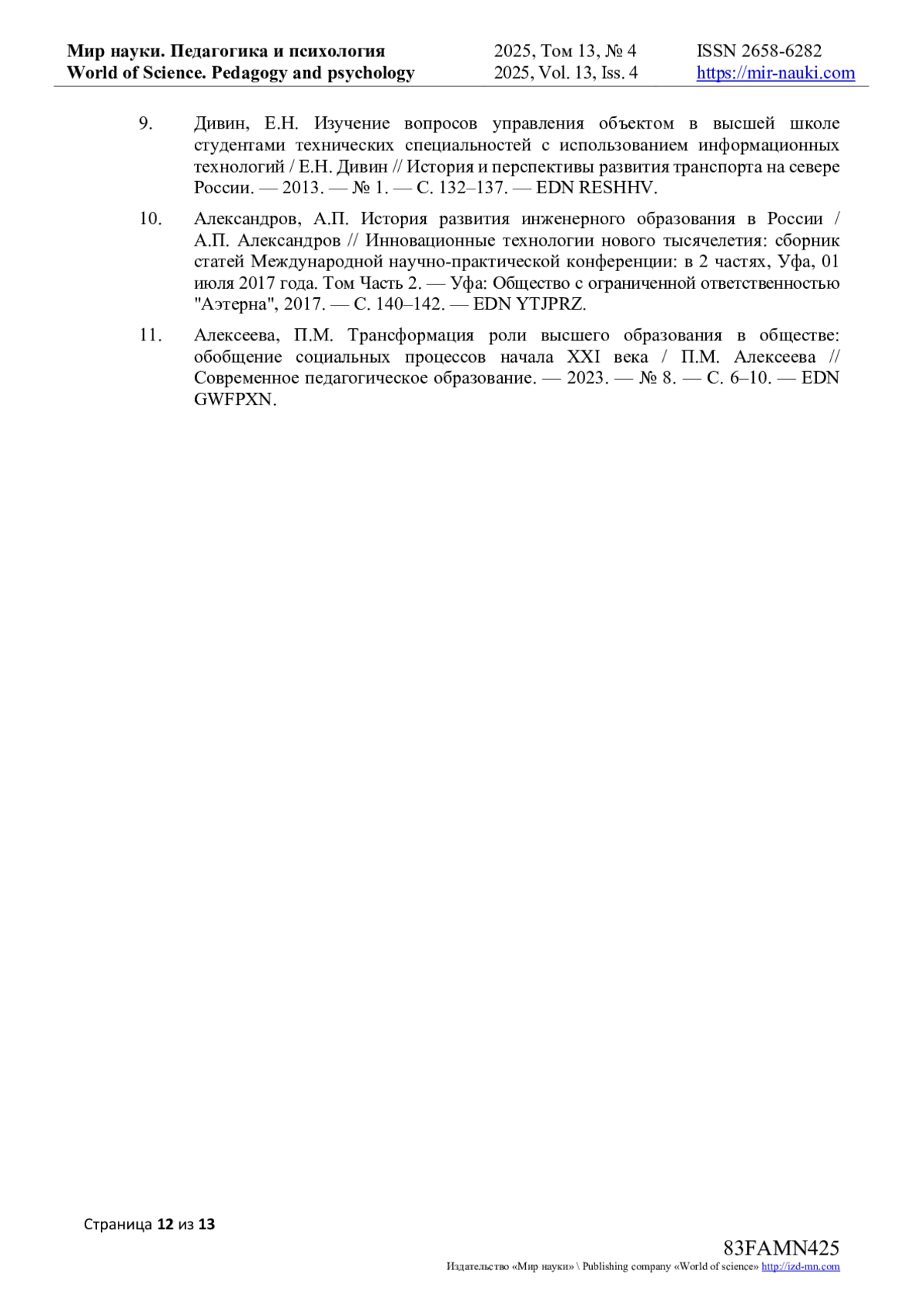 11. Алексеева, П.М. Трансформация роли высшего образования в обществе: обобщение социальных процессов начала XXI века / П.М. Алексеева // Современное педагогическое образование. - 2023. - № 8. - С. 6-10. EDN: GWFPXN