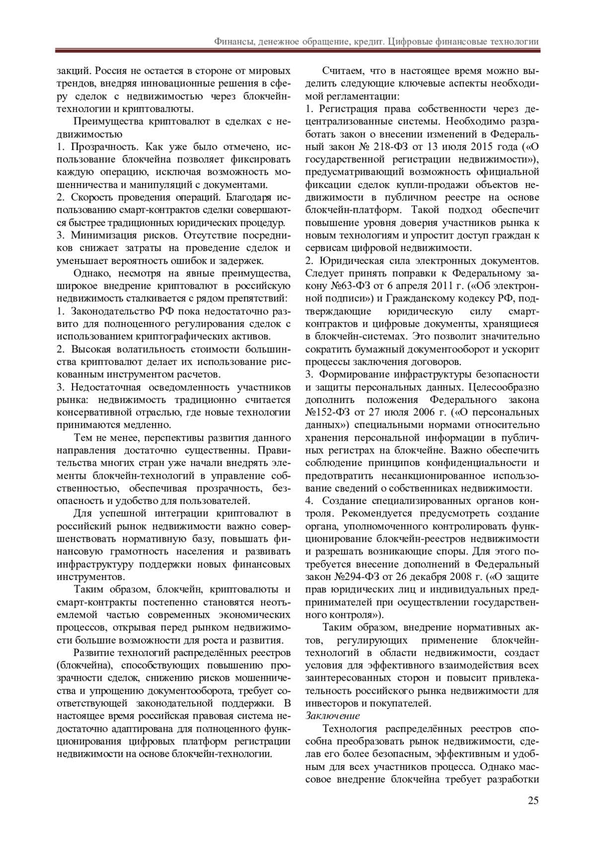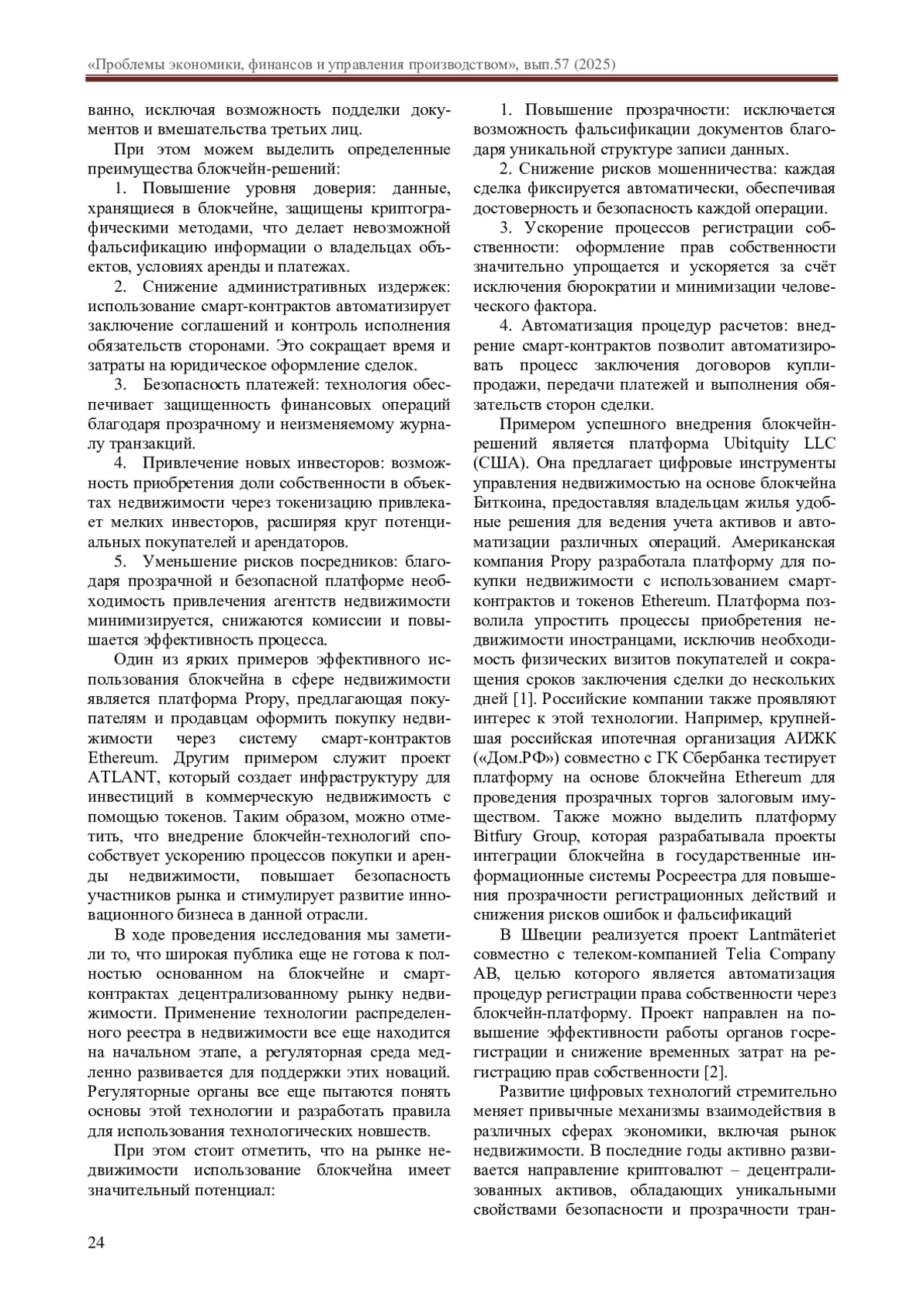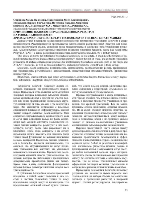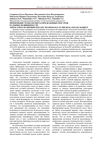 Данная статья посвящена исследованию возможностей применения технологии блокчейн в сфере недвижимости. Рассматриваются преимущества использования распределенных реестров для повышения прозрачности сделок, снижения риска мошенничества и ускорения регистрационных процедур. Анализируются международные практики внедрения блокчейн-решений, такие как платформы Propy и ATLANT, а также российские инициативы, включая проекты Дом. РФ и Bitfury Group.