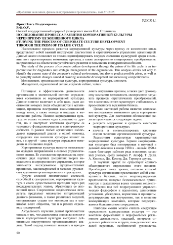 Исследование процесса развития корпоративной культуры через призму ее жизненного цикла представляет собой важный инструмент диагностики и стратегического управления организацией. Данный анализ позволяет не только идентифицировать текущее состояние культурной среды компании, но и прогнозировать возможные кризисы, а также своевременно инициировать преобразования, направленные на обеспечение устойчивого развития и повышение конкурентоспособности.