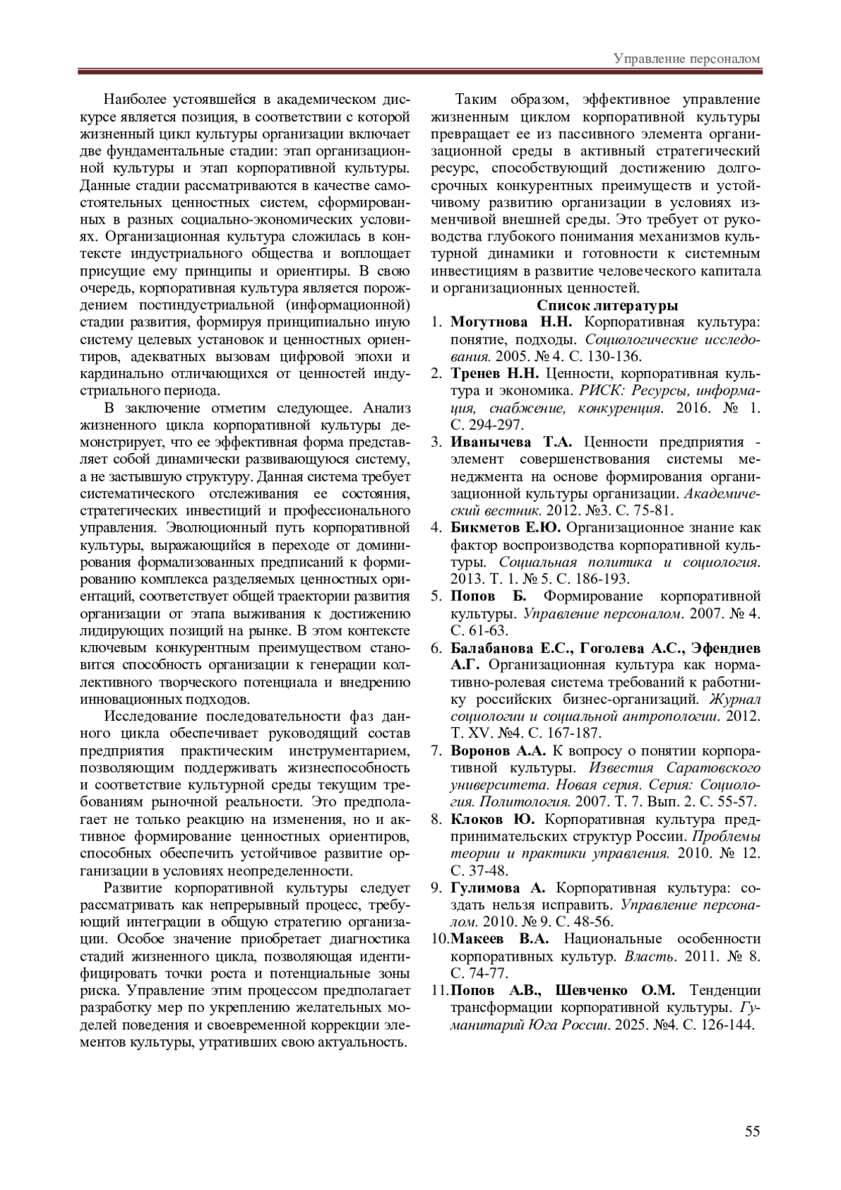 11. Попов А.В., Шевченко О.М. Тенденции трансформации корпоративной культуры. Гуманитарий Юга России. 2025. №4. С. 126-144. EDN: JLCABN