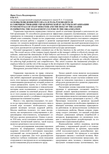 9. Задоренко И.О., Головина Т.А. Организационно-управленческие подходы к развитию организационного поведения в системе управления персоналом. Государственное и муниципальное управление. Ученые записки. 2024. №2. С.25-33. EDN: QYPIIG