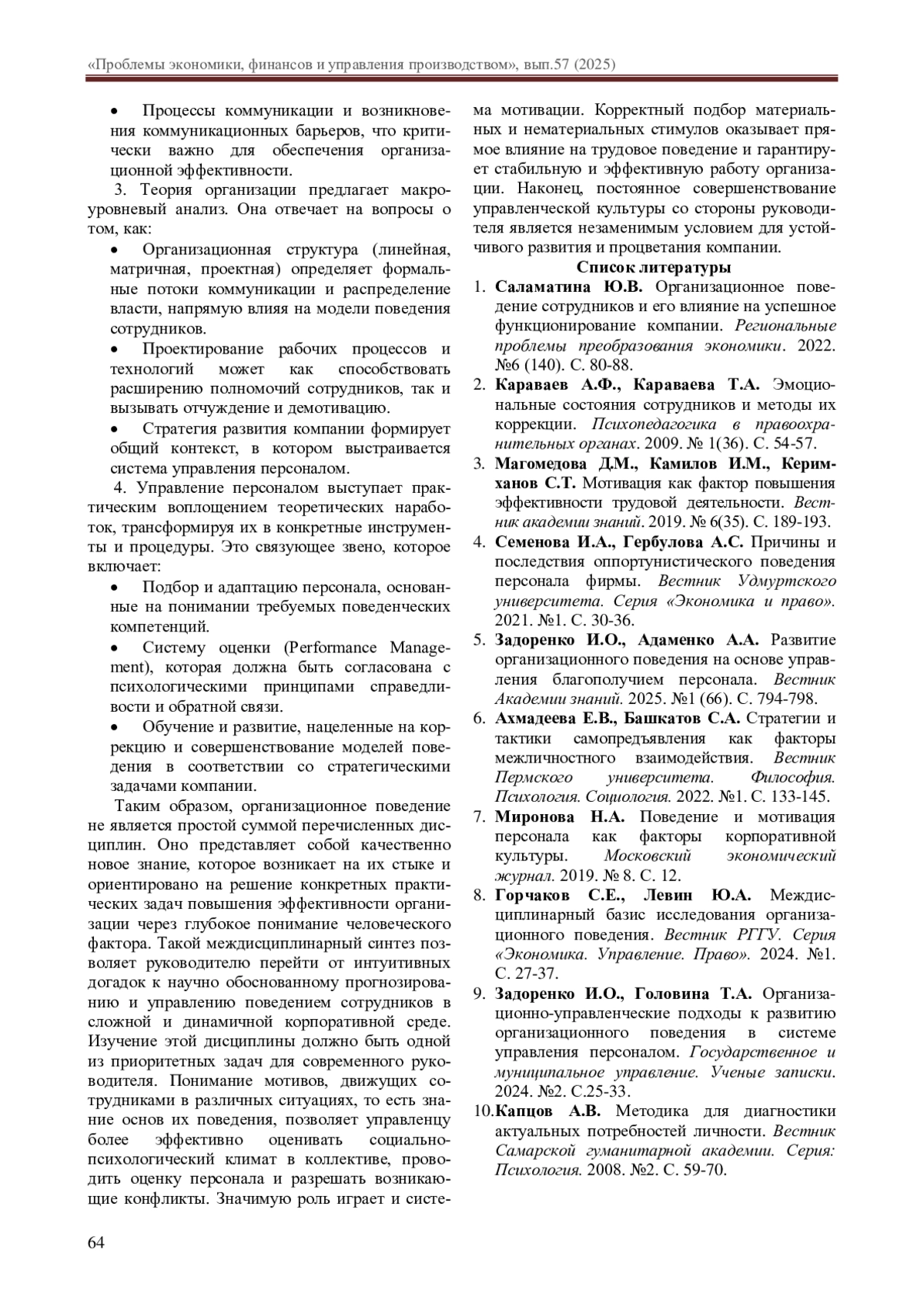 1. Саламатина Ю.В. Организационное поведение сотрудников и его влияние на успешное функционирование компании. Региональные проблемы преобразования экономики. 2022. №6 (140). С. 80-88. EDN: ZKUGHM
