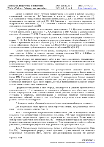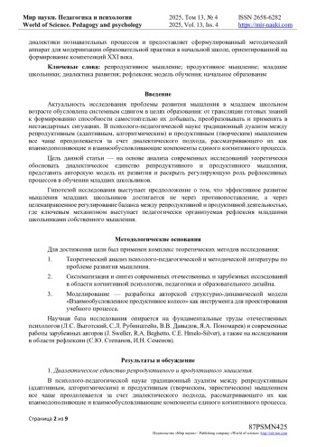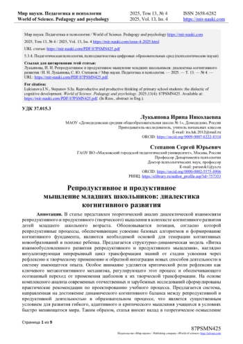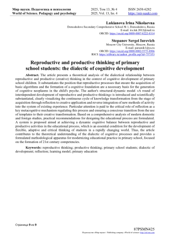 В статье представлен теоретический анализ диалектической взаимосвязи репродуктивного и продуктивного (творческого) мышления в контексте когнитивного развития детей младшего школьного возраста. Обосновывается позиция, согласно которой репродуктивные процессы, обеспечивающие усвоение базовых алгоритмов и формирование когнитивного фундамента, являются необходимой основой для генерации когнитивных новообразований в психике ребенка. Предлагается структурно-динамическая модель «Витка взаимообусловленного развития репродуктивного и продуктивного мышления», наглядно визуализирующая непрерывный цикл трансформации знаний от стадии усвоения через рефлексию к творческому применению и обратной интеграции новых способов деятельности в систему имеющегося опыта. Особое внимание уделяется критической роли рефлексии как ключевого метакогнитивного механизма, регулирующего этот процесс и обеспечивающего осознанный переход от применения шаблонов к их творческой трансформации. На основе комплексного анализа современных отечественных и зарубежных исследований сформулированы практические рекомендации по проектированию учебного процесса. Предлагается система, направленная на достижение динамического когнитивного баланса между репродуктивной и продуктивной деятельностью в образовательном процессе, что является существенным условием для развития гибкого, адаптивного и критического мышления учащихся в условиях быстро меняющегося мира. Таким образом, статья вносит вклад в теоретическое осмысление диалектики познавательных процессов и предоставляет сформулированный методический аппарат для модернизации образовательной практики в начальной школе, ориентированной на формирование компетенций XXI века.