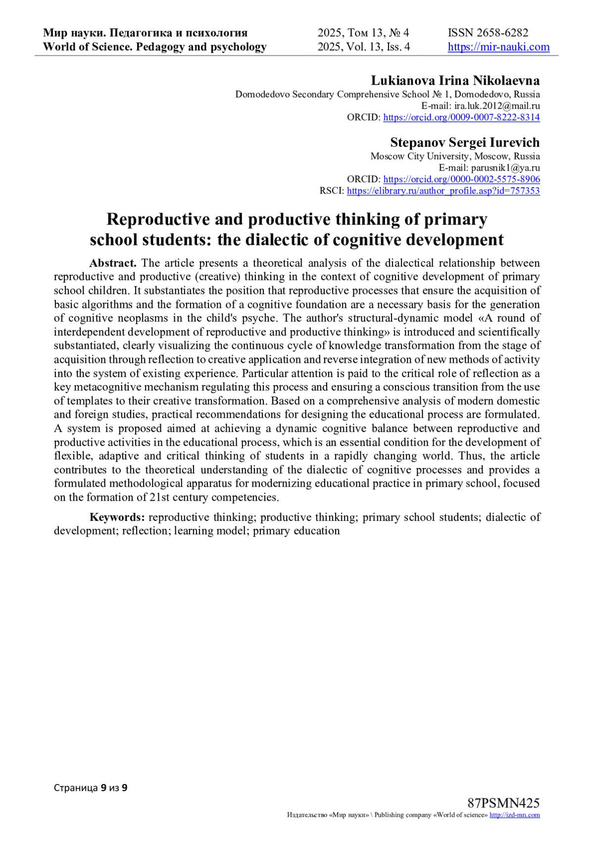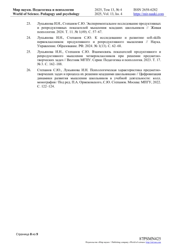 25. Лукьянова И.Н., Степанов С.Ю. Взаимосвязь показателей продуктивного и репродуктивного мышления четвероклассников при решении предметно-творческих задач // Вестник МГПУ. Серия: Педагогика и психология. 2023. Т. 17. № 3. С. 162-188. EDN: FHXRWR