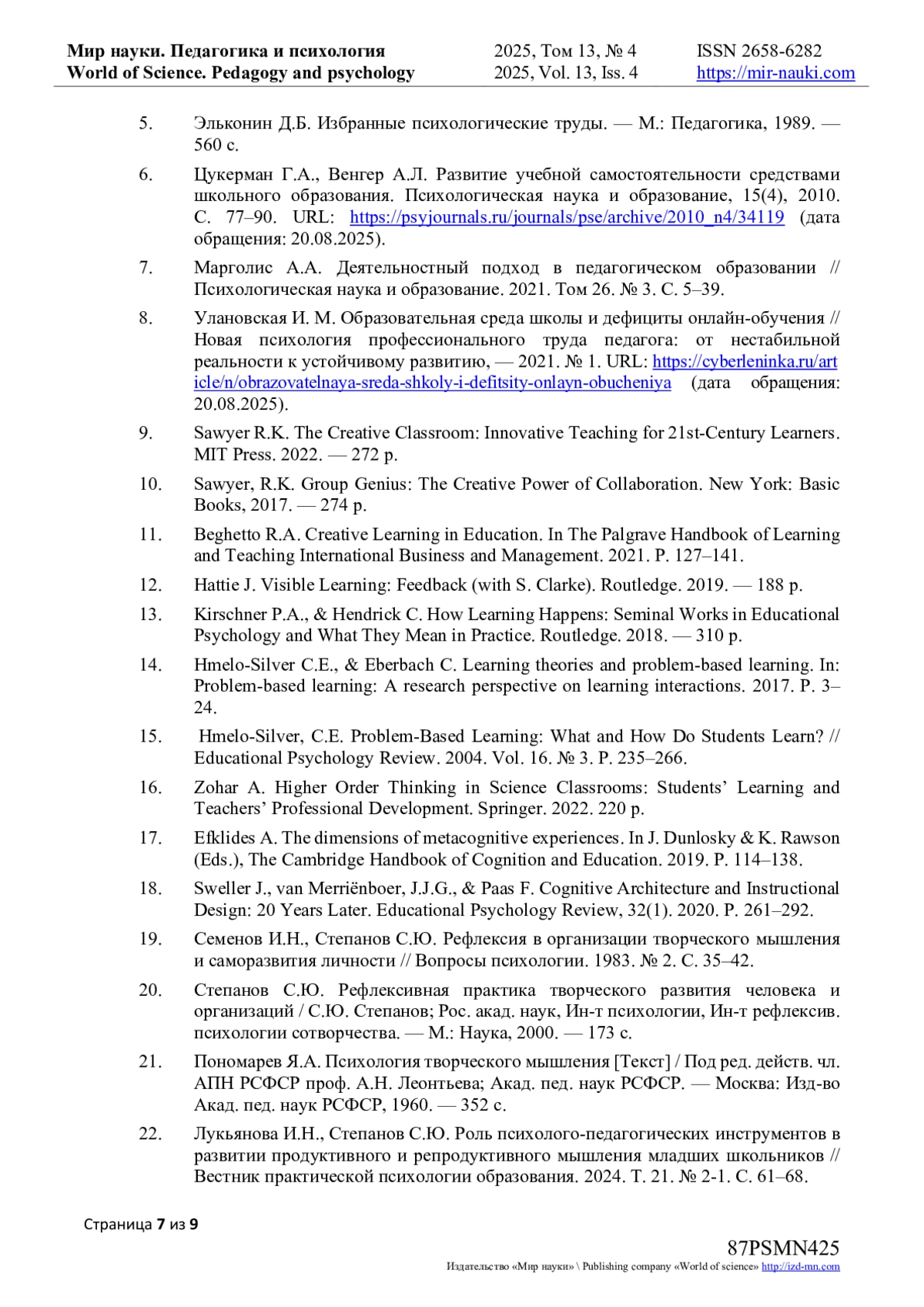 6. Цукерман Г.А., Венгер А.Л. Развитие учебной самостоятельности средствами школьного образования. Психологическая наука и образование, 15(4), 2010. С. 77-90. URL: https://psyjournals.ru/journals/pse/archive/2010_n4/34119 (дата обращения: 20.08.2025). EDN: QYGANZ
