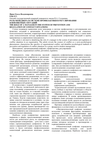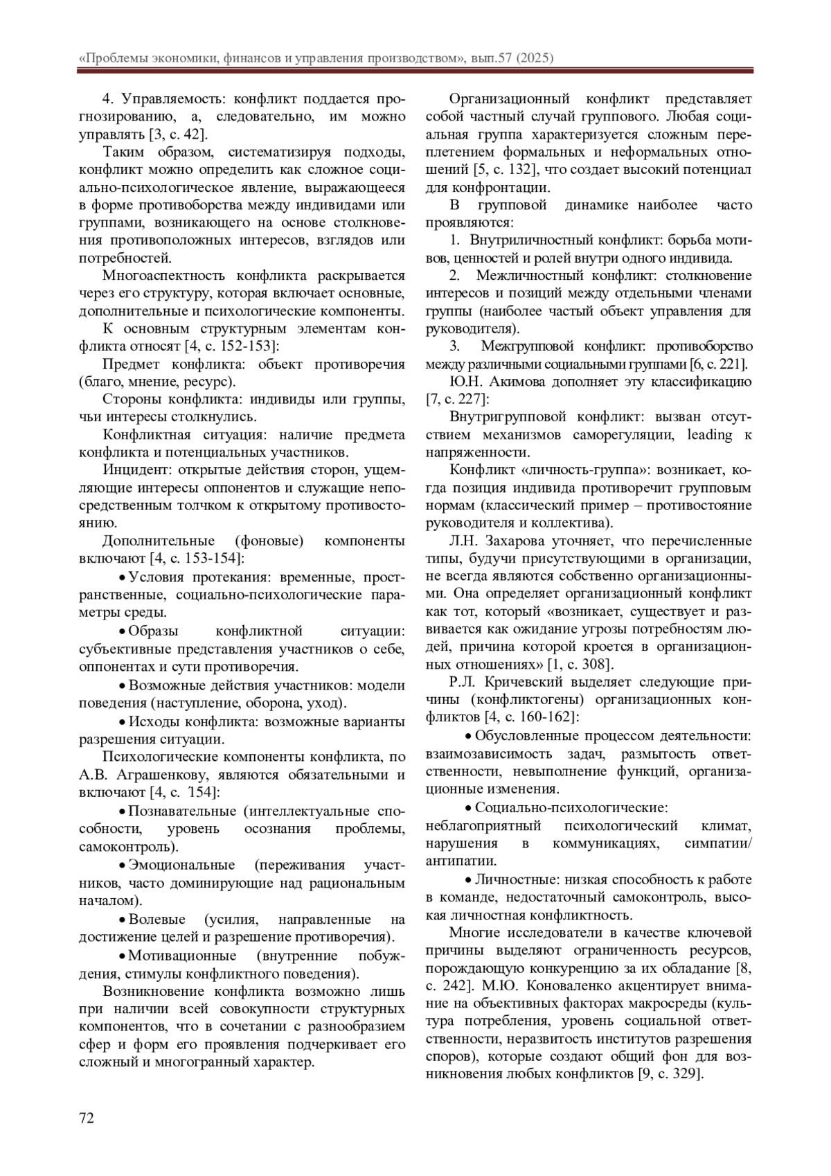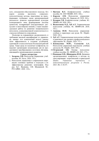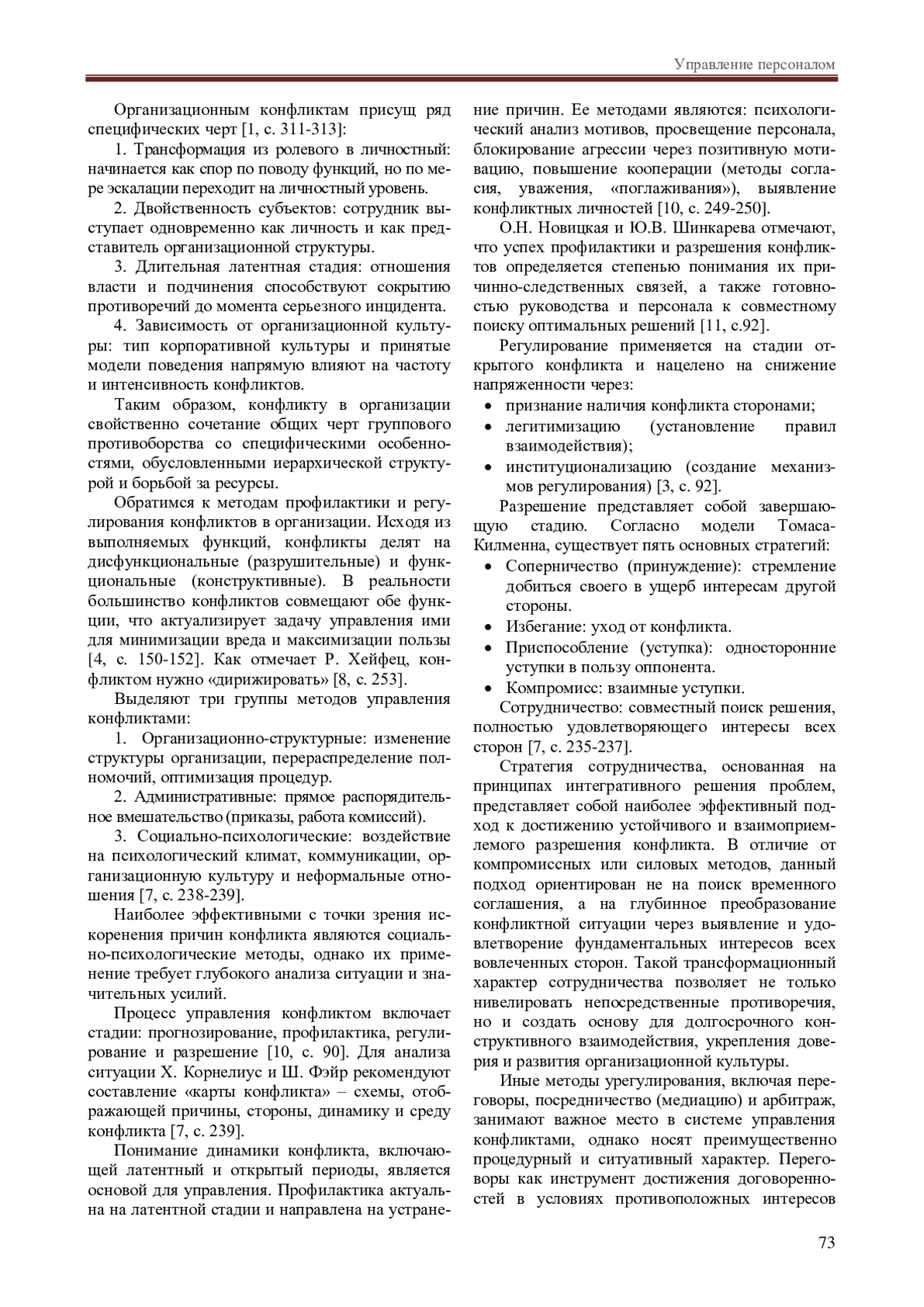 11. Новицкая О.Н., Шинкарева Ю.В. Динамика организационных конфликтов и методы их урегулирования: теоретический и прикладной анализ. Управление персоналом и интеллектуальными ресурсами в России. 2025. №1. С.92-97. EDN: SXIGDT