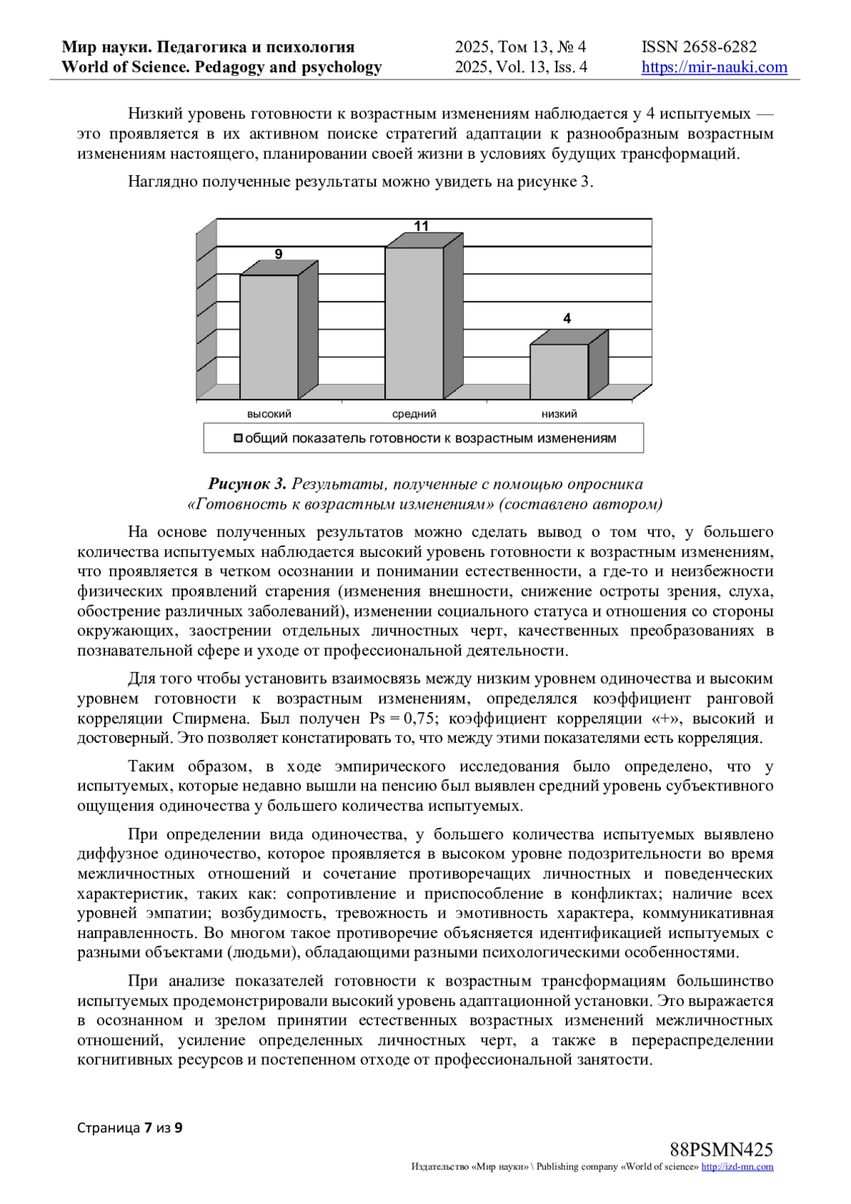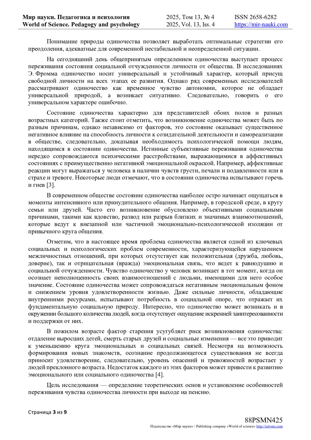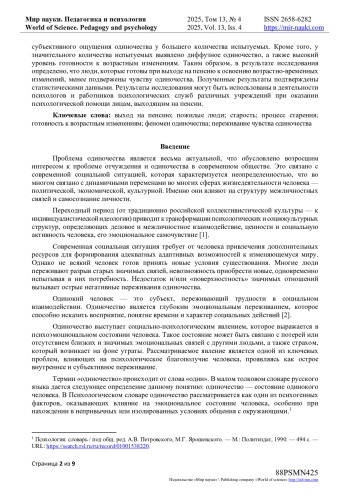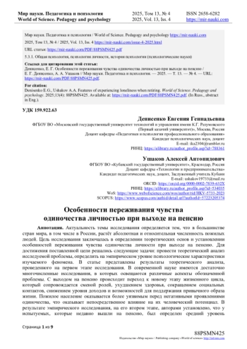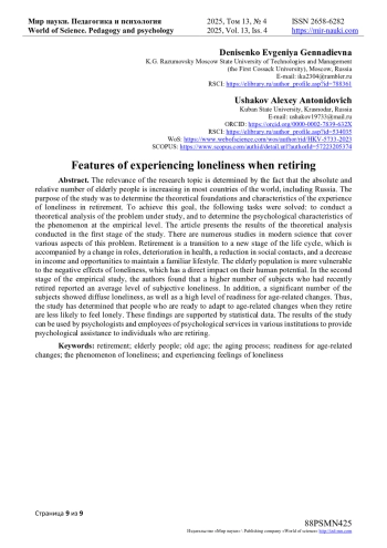 Цель исследования заключалась в определении теоретических основ и установлении особенностей переживания чувства одиночества личности при выходе на пенсию. Для достижения поставленной цели решались следующие задачи: провести теоретический анализ исследуемой проблемы, определить на эмпирическом уровне психологические характеристики изучаемого феномена. В статье представлены результаты теоретического анализа, проведенного на первом этапе исследования. В современной науке имеются достаточно многочисленные исследования, в которых освещаются различные аспекты обозначенной проблемы. С выходом на пенсию происходит переход к новому этапу жизненного цикла, который сопровождается сменой ролей, ухудшением здоровья, сокращением социальных контактов, снижением уровня доходов и возможностей для поддержания привычного образа жизни. Пожилое население оказывается более уязвимым перед негативными проявлениями одиночества, что оказывает непосредственное влияние на их человеческий потенциал. В результате эмпирического исследования, на его втором этапе, авторами установлено, что у испытуемых, которые недавно вышли на пенсию, был определен средний уровень субъективного ощущения одиночества у большего количества испытуемых. Кроме того, у значительного количества испытуемых выявлено диффузное одиночество, а также высокий уровень готовности к возрастным изменениям. Таким образом, в результате исследования определено, что люди, которые готовы при выходе на пенсию к освоению возрастно-временных изменений, менее подвержены чувству одиночества. Полученные результаты подтверждены статистическими данными.
