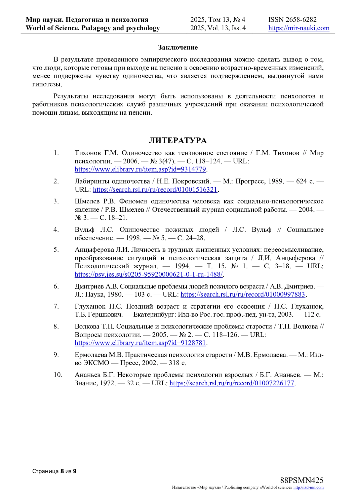 8. Волкова Т.Н. Социальные и психологические проблемы старости / Т.Н. Волкова // Вопросы психологии. - 2005. - № 2. - С. 118-126. - URL: item.asp?id=9128781. EDN: HRTXDP