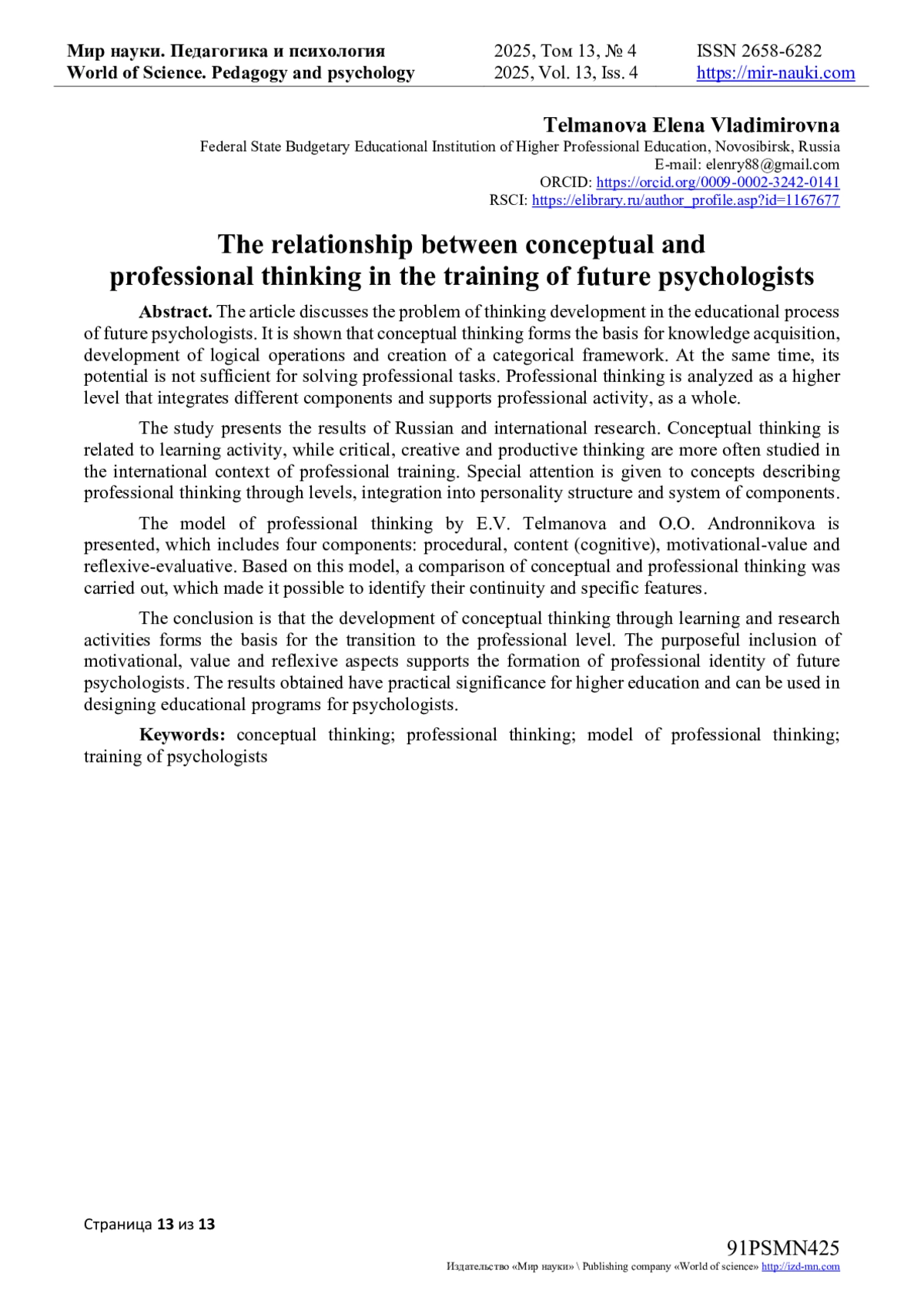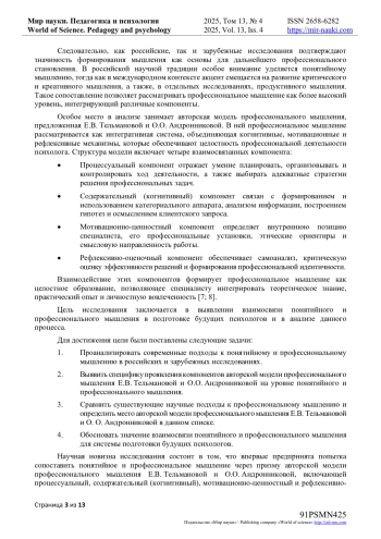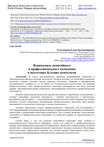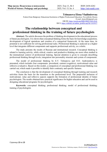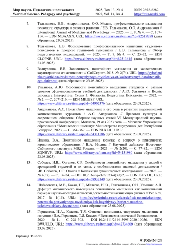 7. Тельманова, Е.В., Андронникова, О.О. Модель профессионального мышления психолога: структура и условия развития / Е.В. Тельманова, О.О. Андронникова // International Journal of Medicine and Psychology. - 2025. - Т. 8, № 4. - С. 107-114. URL: item.asp?id=82517878 (дата обращения: 23.08.2025). EDN: MBAAXN