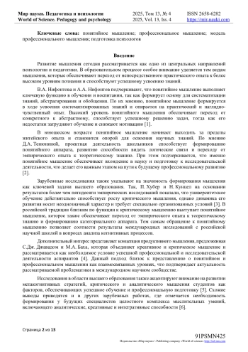 В работе представлены результаты анализа российских и зарубежных исследований, в которых понятийное мышление связывается с учебной деятельностью, а критическое, креативное и продуктивное - с международным контекстом подготовки специалистов. Особое внимание уделено концепциям, описывающим профессиональное мышление через уровни, включенность в личностную структуру и систему компонентов.