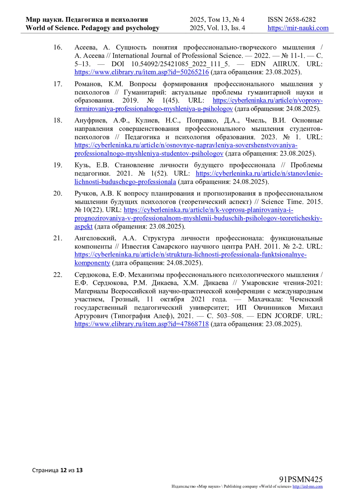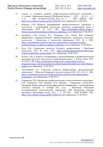 16. Асеева, А. Сущность понятия профессионально-творческого мышления / А. Асеева // International Journal of Professional Science. - 2022. - № 11-1. - С. 5-13. URL: item.asp?id=50265216 (дата обращения: 23.08.2025). DOI: 10.54092/25421085_2022_111_5 EDN: AIIRUX