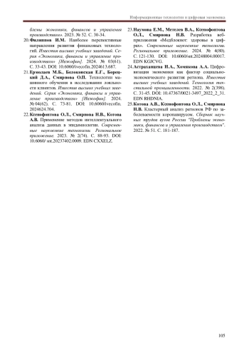 22. Ксенофонтова О.Л., Смирнова Н.В., Котова А.В. Применение методов интеллектуального анализа данных в эпидемиологии. Современные наукоемкие технологии. Региональное приложение. 2023. № 2(74). С. 88-93. DOI: 10.6060/snt.20237402.0009 EDN: CXXELZ
