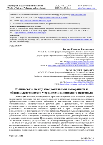 1. Смольникова П.С., Трункова К.С., Мадьянова В.В., Хальфин Р.А. Распространенность синдрома эмоционального выгорания медицинских работников в Российской Федерации: систематический обзор и метаанализ / П.С. Смольникова, К.С. Трункова, В.В. Мадьянова, Р.А. Хальфин - // Проблемы социальной гигиены, здравоохранения и истории медицины. - 2023. - 31(3). - С. 387-399. DOI: 10.32687/0869-866X-2023-31-3-387-399