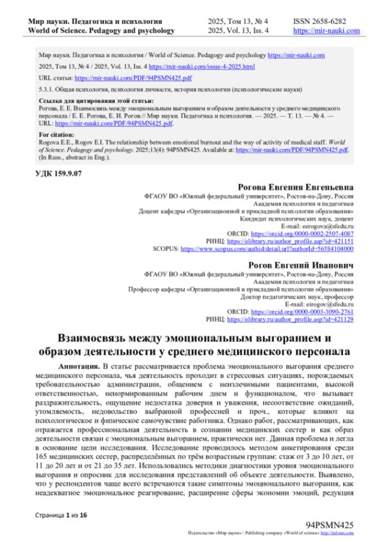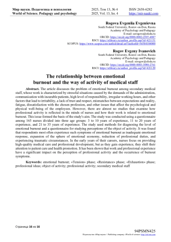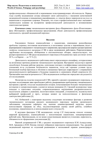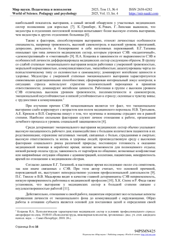 7. Ахмадуллина К.М., Аркашева М.Н., Попова Н.М. Сравнительный анализ проявлений синдрома эмоционального выгорания у медицинских сестер различной специализации / К.М. Ахмадуллина, М.Н. Аркашева, Н.М. Попова // Modern Science. - 2023. - № 1-2. - С. 45-47.
