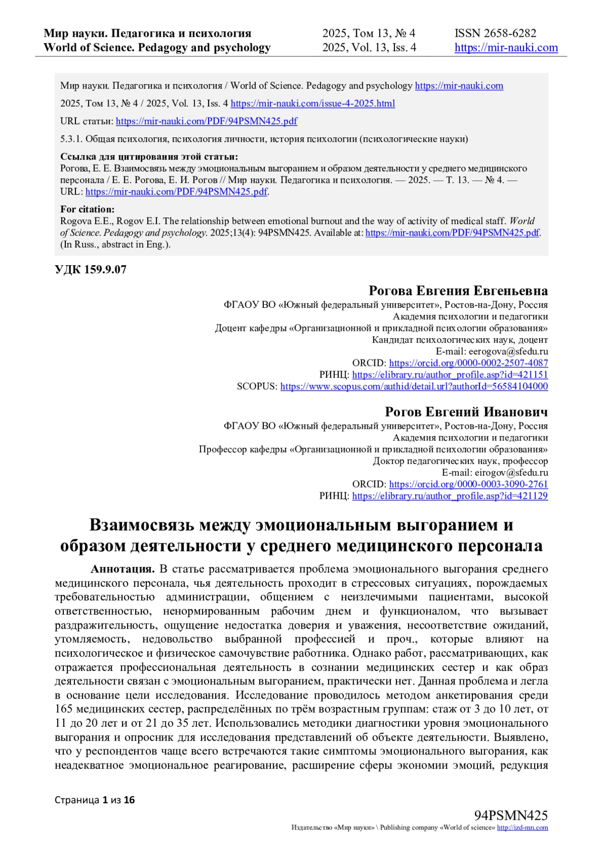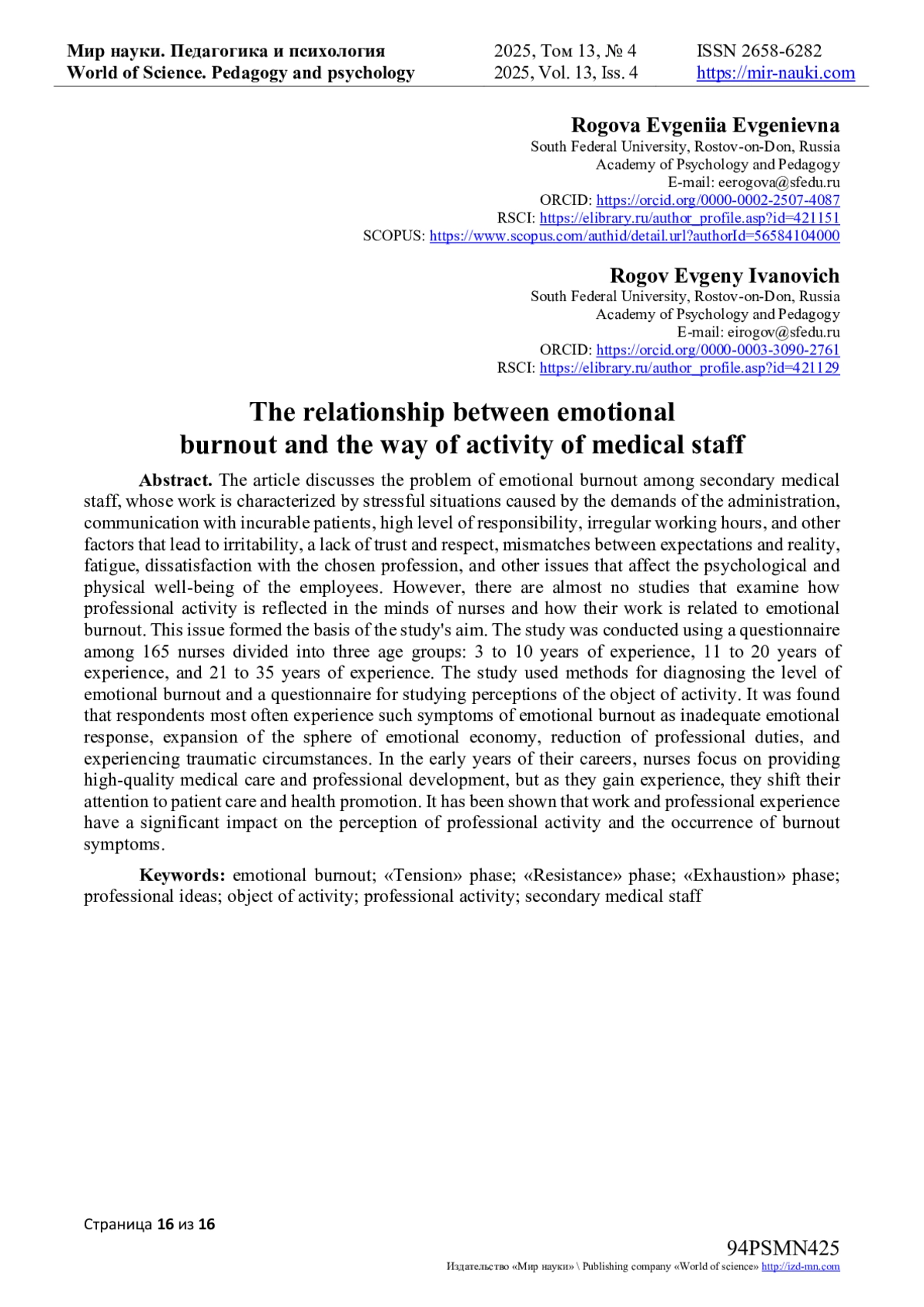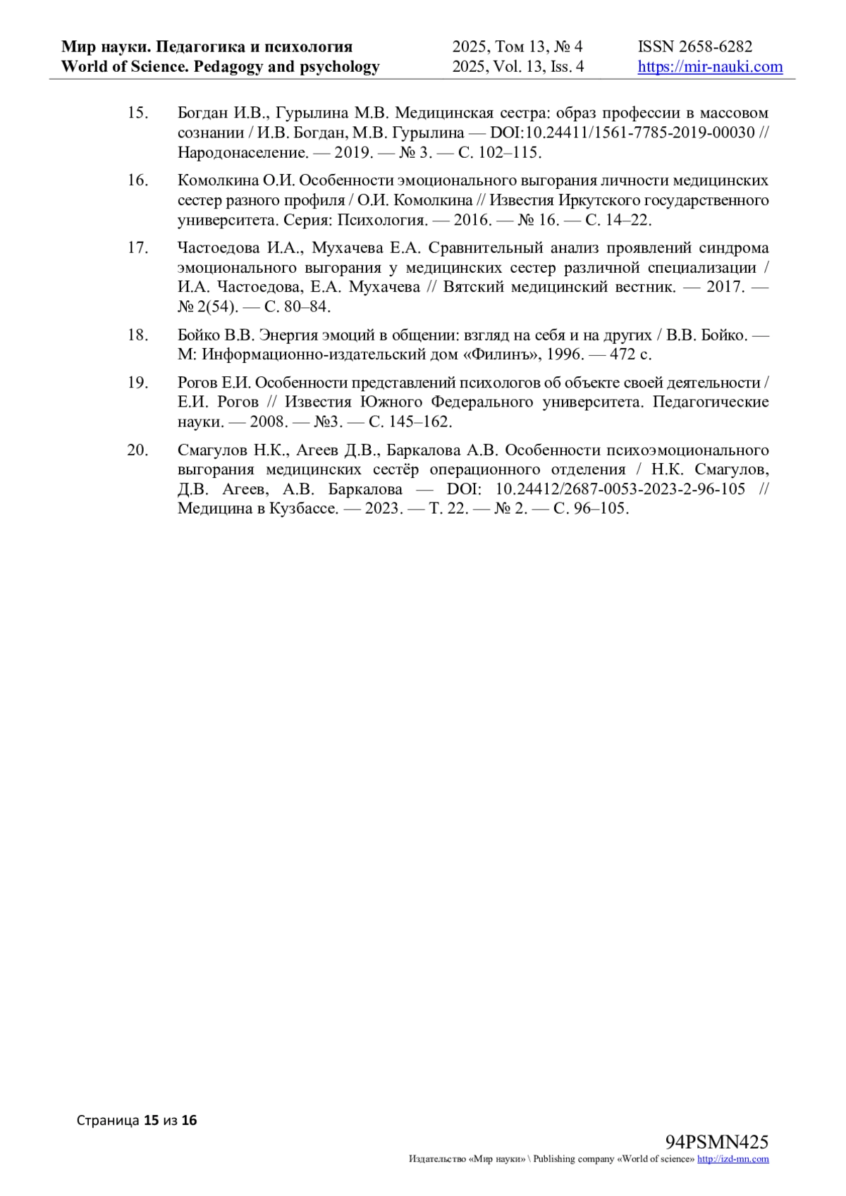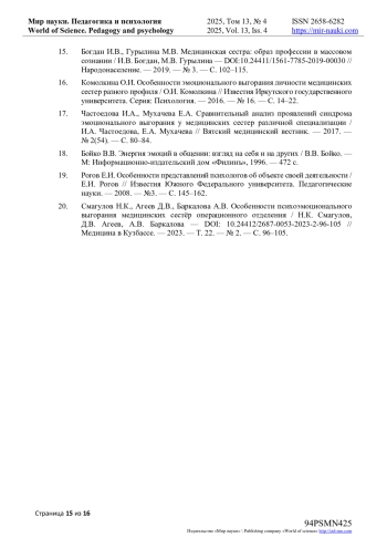 16. Комолкина О.И. Особенности эмоционального выгорания личности медицинских сестер разного профиля / О.И. Комолкина // Известия Иркутского государственного университета. Серия: Психология. - 2016. - № 16. - С. 14-22. EDN: TWUZXO