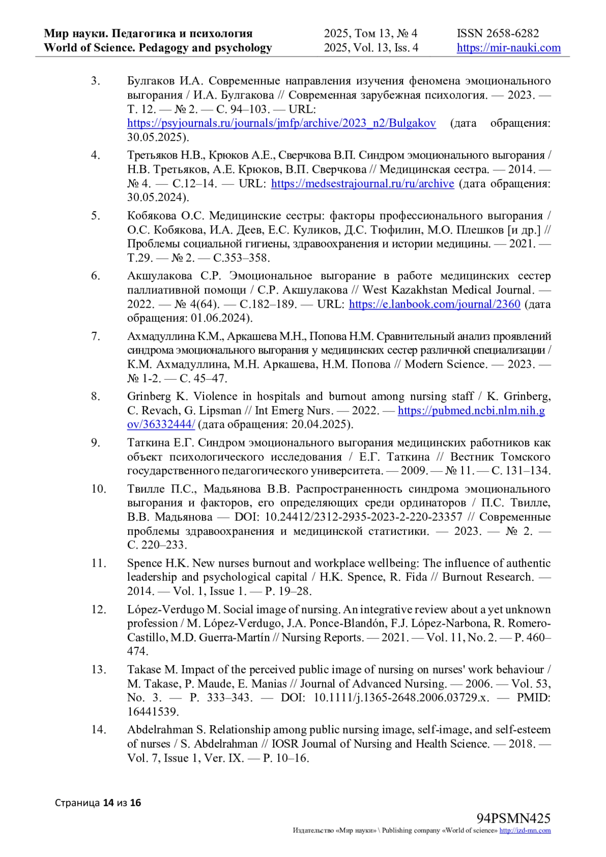 3. Булгаков И.А. Современные направления изучения феномена эмоционального выгорания / И.А. Булгакова // Современная зарубежная психология. - 2023. - Т. 12. - № 2. - С. 94-103. - URL: https://psyjournals.ru/journals/jmfp/archive/2023_n2/Bulgakov (дата обращения: 30.05.2025). EDN: JZWZJF