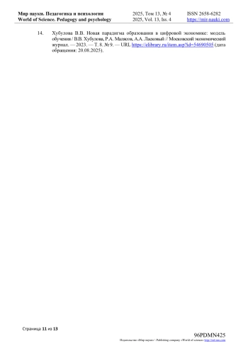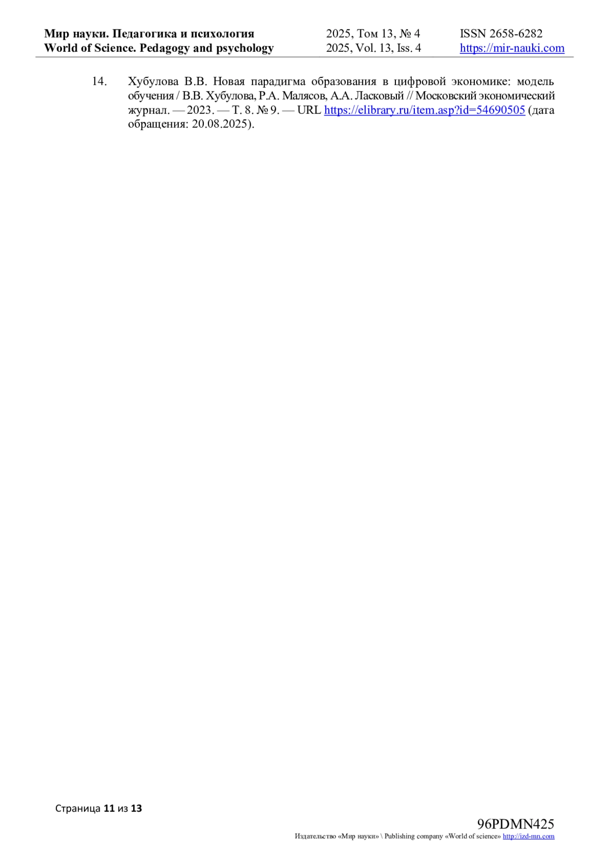 14. Хубулова В.В. Новая парадигма образования в цифровой экономике: модель обучения / В.В. Хубулова, Р.А. Малясов, А.А. Ласковый // Московский экономический журнал. - 2023. - Т. 8. № 9. - URL item.asp?id=54690505 (дата обращения: 20.08.2025). EDN: XBGAQY