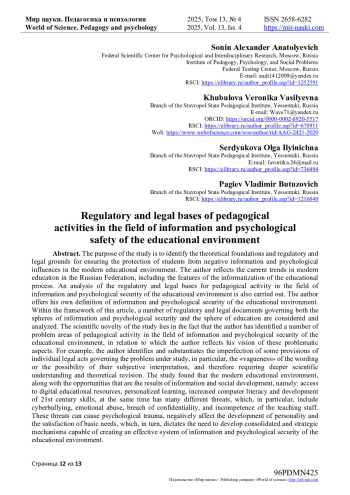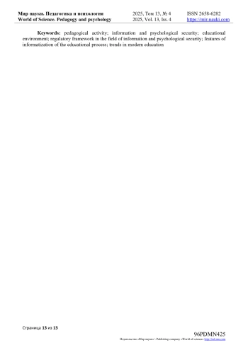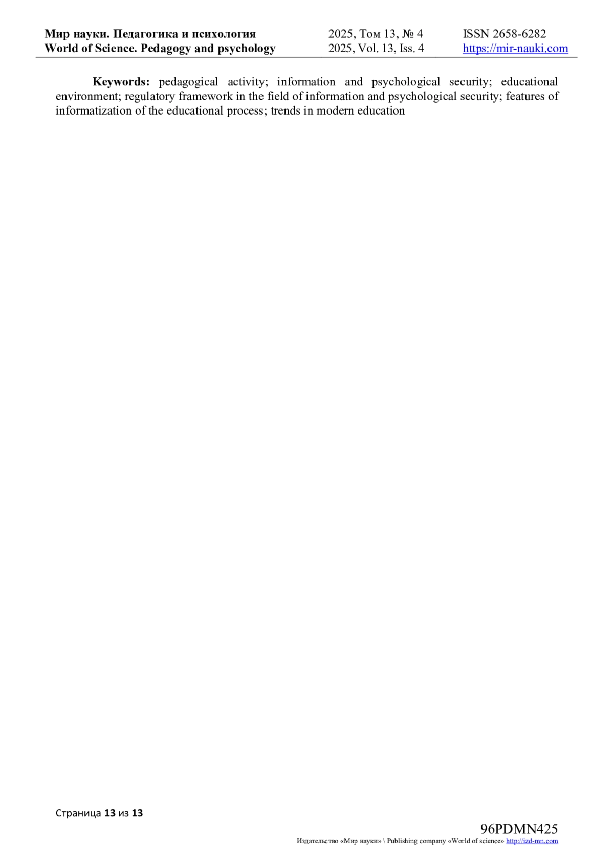 13. Рерке В.И. Информационно-психологическая безопасность как научно-исследовательская дефиниция // В.И. Рерке, И.С. Бубнова, В.И. Демаков Научно педагогическое обозрение (Pedagogical Review). - 2022. Вып. 5(45). - С. 202-00. - URL: https://cyberleninka.ru/article/n/informatsionno-psihologicheskaya-bezopasnost-kak-nauchno-issledovatelskaya-definitsiya (дата обращения: 20.08.2025). DOI: 10.23951/2307-6127-2022-5-202-211
