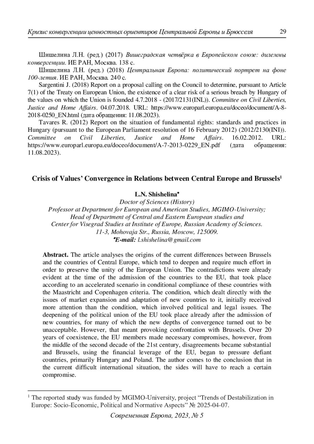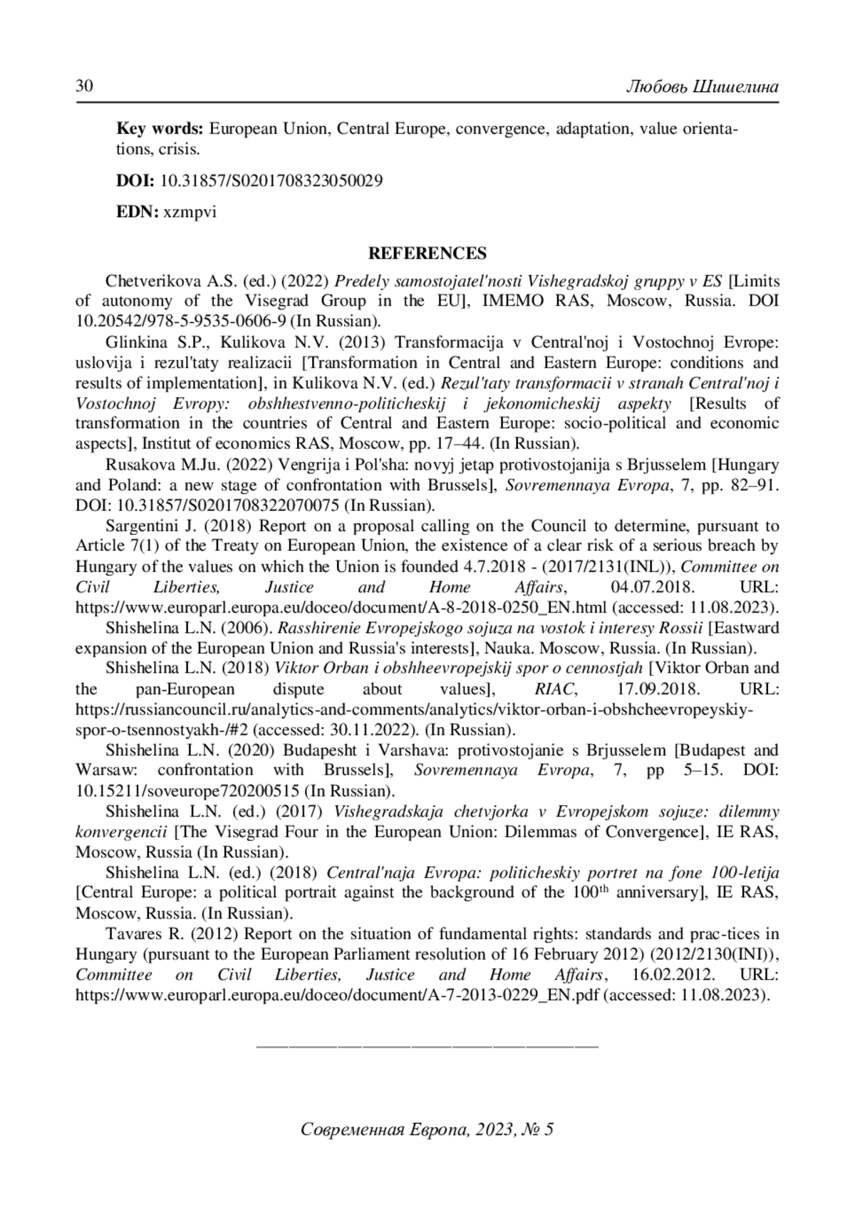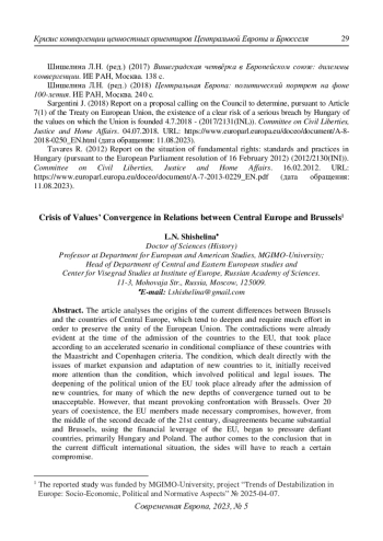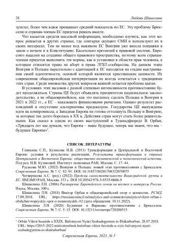 6. Шишелина Л.Н. (2020) Будапешт и Варшава: противостояние с Брюсселем. Современная Европа. № 7. С. 5-15. DOI: 10.15211/soveurope720200515 EDN: ZCCCAL