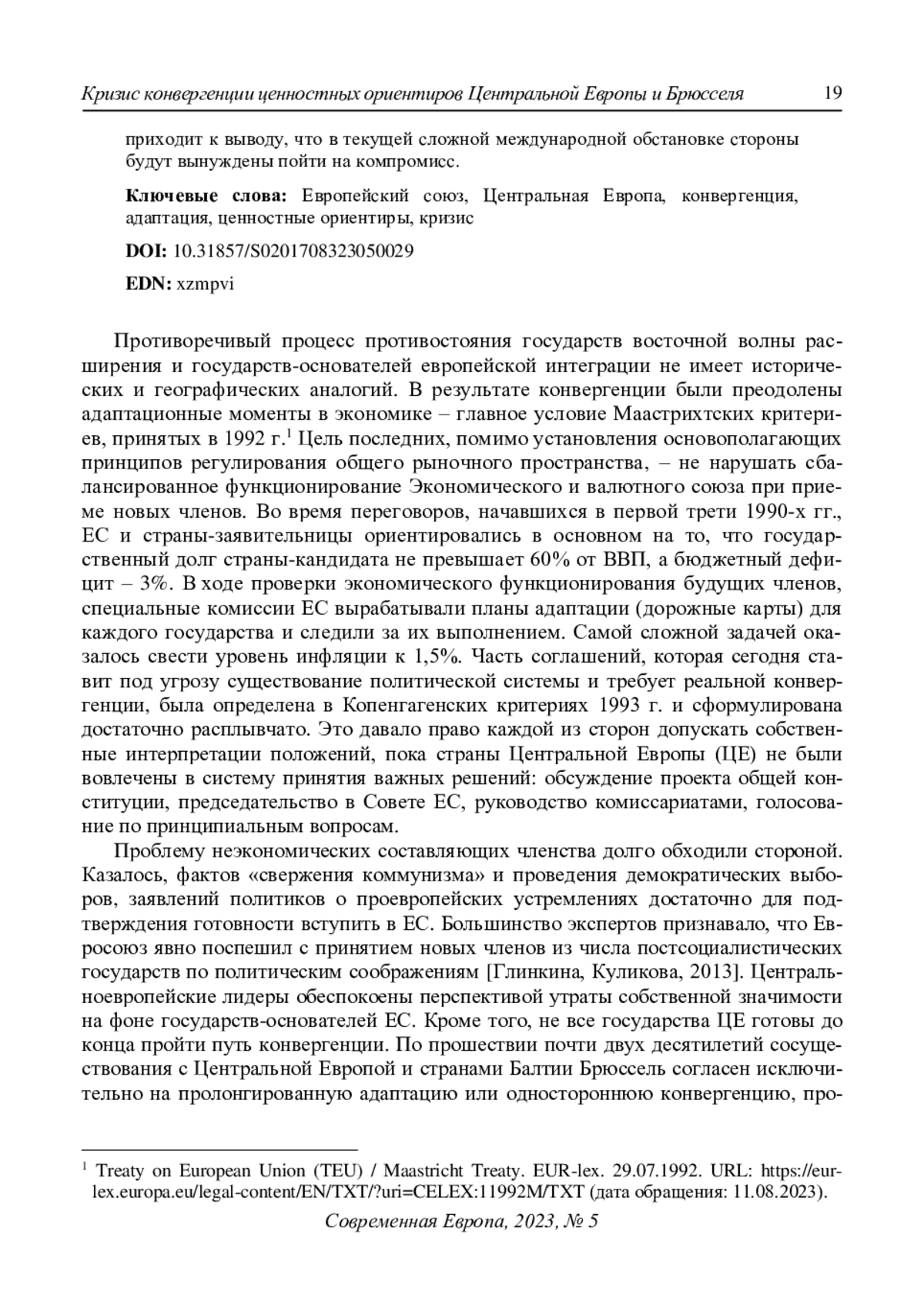 Противоречивый процесс противостояния государств восточной волны расширения и государств-основателей европейской интеграции не имеет исторических и географических аналогий. В результате конвергенции были преодолены адаптационные моменты в экономике – главное условие Маастрихтских критериев, принятых в 1992 г.1 Цель последних, помимо установления основополагающих принципов регулирования общего рыночного пространства, – не нарушать сбалансированное функционирование Экономического и валютного союза при приеме новых членов. Во время переговоров, начавшихся в первой трети 1990-х гг., ЕС и страны-заявительницы ориентировались в основном на то, что государственный долг страны-кандидата не превышает 60% от ВВП, а бюджетный дефицит – 3%. В ходе проверки экономического функционирования будущих членов, специальные комиссии ЕС вырабатывали планы адаптации (дорожные карты) для каждого государства и следили за их выполнением. Самой сложной задачей оказалось свести уровень инфляции к 1,5%. Часть соглашений, которая сегодня ставит под угрозу существование политической системы и требует реальной конвергенции, была определена в Копенгагенских критериях 1993 г. и сформулирована достаточно расплывчато. Это давало право каждой из сторон допускать собственные интерпретации положений, пока страны Центральной Европы (ЦЕ) не были вовлечены в систему принятия важных решений: обсуждение проекта общей конституции, председательство в Совете ЕС, руководство комиссариатами, голосование по принципиальным вопросам