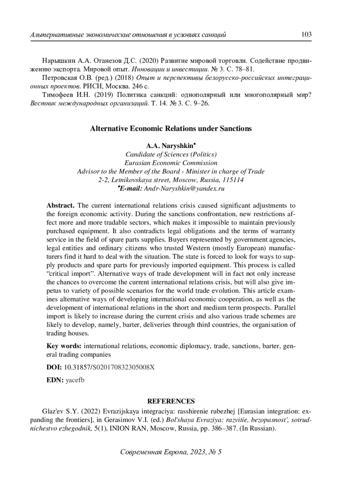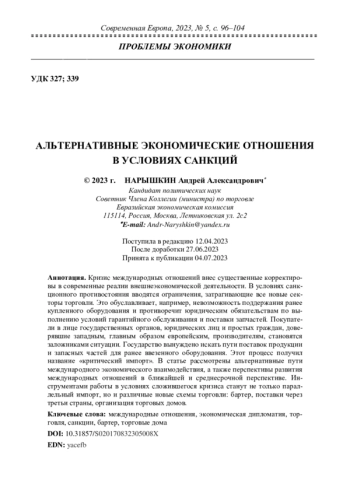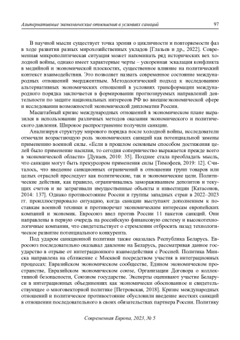В научной мысли существует точка зрения о цикличности и повторяемости фаз в ходе развития разных мирохозяйственных укладов [Глазьев и др., 2022]. Современная микрополитическая ситуация может напоминать ряд исторических вех холодной войны, однако имеет характерные черты – ускоренная эскалация конфликта в медийной и экономической плоскостях, существенное влияние на политический контекст взаимодействия. Это позволяет назвать современное состояние международных отношений эмерджентным. Методологический подход к исследованию альтернативных экономических отношений в условиях трансформации международного порядка заключается в формировании прогнозируемых направлений деятельности по защите национальных интересов РФ во внешнеэкономической сфере и исследовании возможностей экономической дипломатии России.