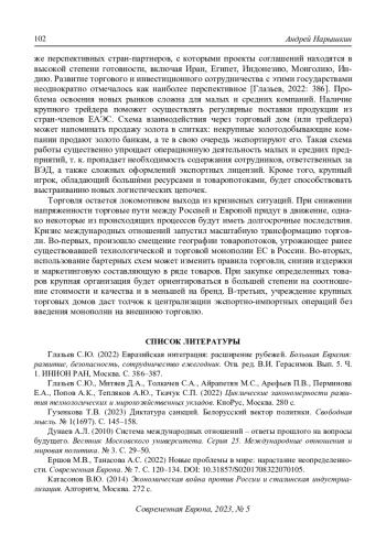 1. Глазьев С.Ю. (2022) Евразийская интеграция: расширение рубежей. Большая Евразия: развитие, безопасность, сотрудничество ежегодник. Отв. ред. В.И. Герасимов. Вып. 5. Ч. 1. ИНИОН РАН, Москва. С. 386-387. EDN: EIUTQP