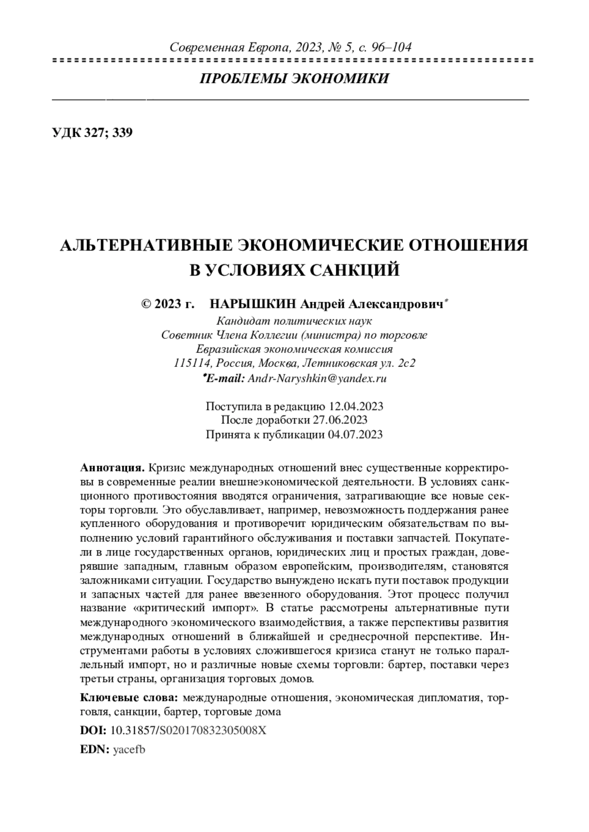 Кризис международных отношений внес существенные корректировы в современные реалии внешнеэкономической деятельности. В условиях санкционного противостояния вводятся ограничения, затрагивающие все новые секторы торговли. Это обуславливает, например, невозможность поддержания ранее купленного оборудования и противоречит юридическим обязательствам по выполнению условий гарантийного обслуживания и поставки запчастей. Покупатели в лице государственных органов, юридических лиц и простых граждан, доверявшие западным, главным образом европейским, производителям, становятся заложниками ситуации. Государство вынуждено искать пути поставок продукции и запасных частей для ранее ввезенного оборудования. Этот процесс получил название «критический импорт». В статье рассмотрены альтернативные пути международного экономического взаимодействия, а также перспективы развития международных отношений в ближайшей и среднесрочной перспективе. Инструментами работы в условиях сложившегося кризиса станут не только параллельный импорт, но и различные новые схемы торговли: бартер, поставки через третьи страны, организация торговых домов