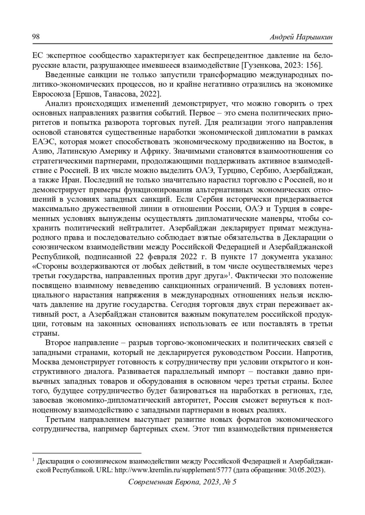 3. Гузенкова Т.В. (2023) Диктатура санкций. Белорусский вектор политики. Свободная мысль. № 1(1697). С. 145-158.