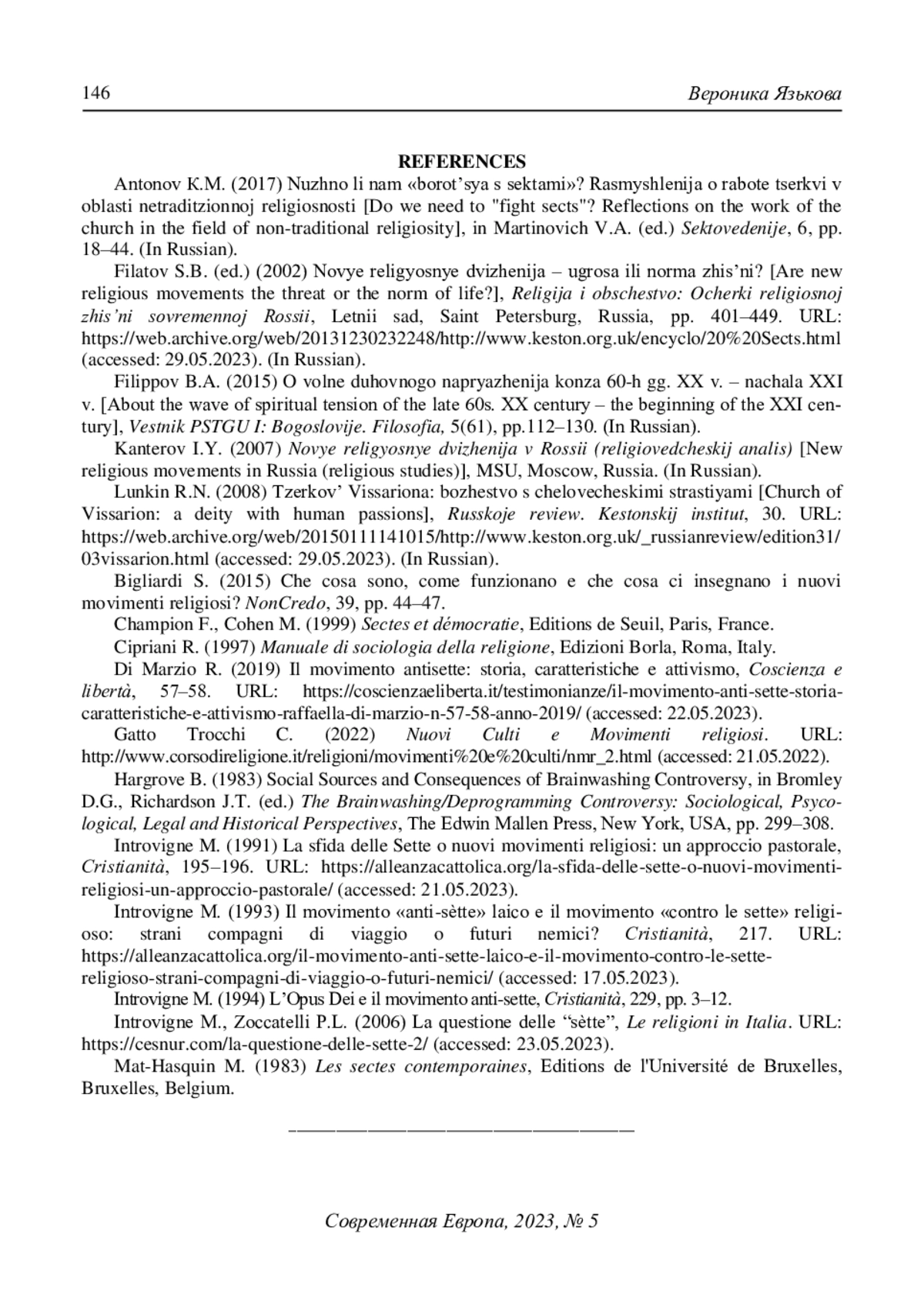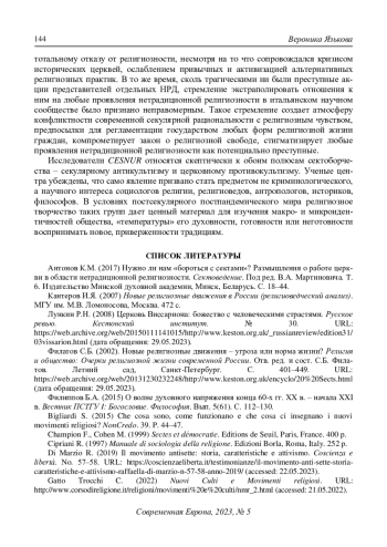 13. Introvigne M. (1993) Il movimento “anti-sètte” laico e il movimento “contro le sette” religioso: strani compagni di viaggio o futuri nemici? Cristianità. No. 217. URL: https://alleanzacattolica.org/il-movimento-anti-sette-laico-e-il-movimento-contro-le-sette-religioso-strani-compagni-di-viaggio-o-futuri-nemici/(accessed: 17.05.2023).