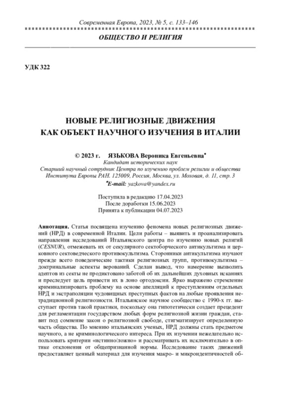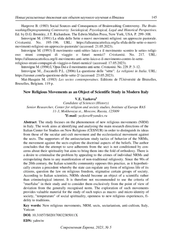 Статья посвящена изучению феномена новых религиозных движений (НРД) в современной Италии. Цели работы ‒ выявить и проанализировать направления исследований Итальянского центра по изучению новых религий (CESNUR), отмежевать их от секулярного сектоборческого антикультизма и церковного сектоведческого противокультизма. Сторонники антикультизма изучают прежде всего поведенческие тактики религиозных групп, противокультизма ‒ доктринальные аспекты верований. Сделан вывод, что намерение вызволить адептов из секты не продиктовано заботой об их дальнейших духовных исканиях и преследует цель привести их в лоно ортодоксии. Ярко выражено стремление криминализировать проблему на основе апелляций к преступлениям отдельных НРД и экстраполяции чудовищных преступных фактов на любые проявления нетрадиционной религиозности. Итальянское научное сообщество с 1990-х гг. выступает против такой практики, поскольку она гипотетически создает прецедент для регламентации государством любых форм религиозной жизни граждан, ставит под сомнение закон о религиозной свободе, стигматизирует определенную часть общества. По мнению итальянских ученых, НРД должны стать предметом научного, а не криминологического интереса. При их изучении нежелательно использовать критерии «истинно/ложно» и рассматривать их исключительно в оптике отклонения от общепризнанной нормы. Исследование таких движений предоставляет ценный материал для изучения макро- и микроидентичностей общества, уровня и качества его духовности, открытости новому религиозному опыту, приверженности традициям