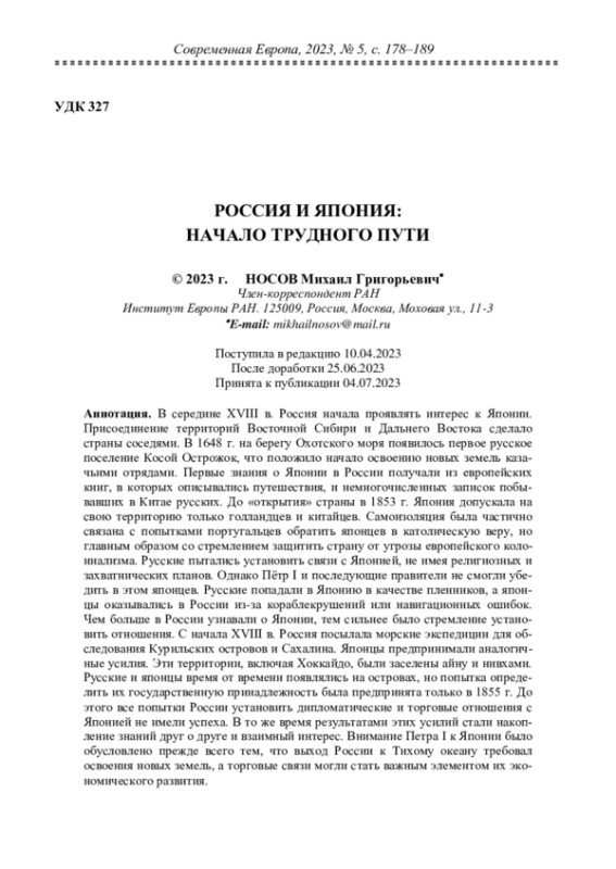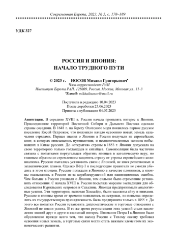 В середине XVIII в. Россия начала проявлять интерес к Японии. Присоединение территорий Восточной Сибири и Дальнего Востока сделало страны соседями. В 1648 г. на берегу Охотского моря появилось первое русское поселение Косой Острожок, что положило начало освоению новых земель казачьими отрядами. Первые знания о Японии в России получали из европейских книг, в которых описывались путешествия, и немногочисленных записок побывавших в Китае русских. До «открытия» страны в 1853 г. Япония допускала на свою территорию только голландцев и китайцев. Самоизоляция была частично связана с попытками португальцев обратить японцев в католическую веру, но главным образом со стремлением защитить страну от угрозы европейского колониализма. Русские пытались установить связи с Японией, не имея религиозных и захватнических планов. Однако Пётр I и последующие правители не смогли убедить в этом японцев. Русские попадали в Японию в качестве пленников, а японцы оказывались в России из-за кораблекрушений или навигационных ошибок. Чем больше в России узнавали о Японии, тем сильнее было стремление установить отношения. С начала XVIII в. Россия посылала морские экспедиции для обследования Курильских островов и Сахалина. Японцы предпринимали аналогичные усилия. Эти территории, включая Хоккайдо, были заселены айну и нивхами. Русские и японцы время от времени появлялись на островах, но попытка определить их государственную принадлежность была предпринята только в 1855 г. До этого все попытки России установить дипломатические и торговые отношения с Японией не имели успеха. В то же время результатами этих усилий стали накопление знаний друг о друге и взаимный интерес. Внимание Петра I к Японии было обусловлено прежде всего тем, что выход России к Тихому океану требовал освоения новых земель, а торговые связи могли стать важным элементом их экономического развития