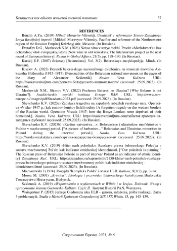 8. Шевченко К.В. (2019) “Хитер наш полешук”. Русская пресса белорусского Полесья в составе межвоенной Польши как индикатор этнической идентичности. Западная Русь. URL: https://zapadrus.su/zaprus/istbl/2130-khiter-nash-poleshuk-russkaya-pressa-belorusskogo-polesya-v-sostave-mezhvoennoj-polshi-kak-indikator-etnicheskoj-identichnosti.html (дата обращения: 25.09.2023).